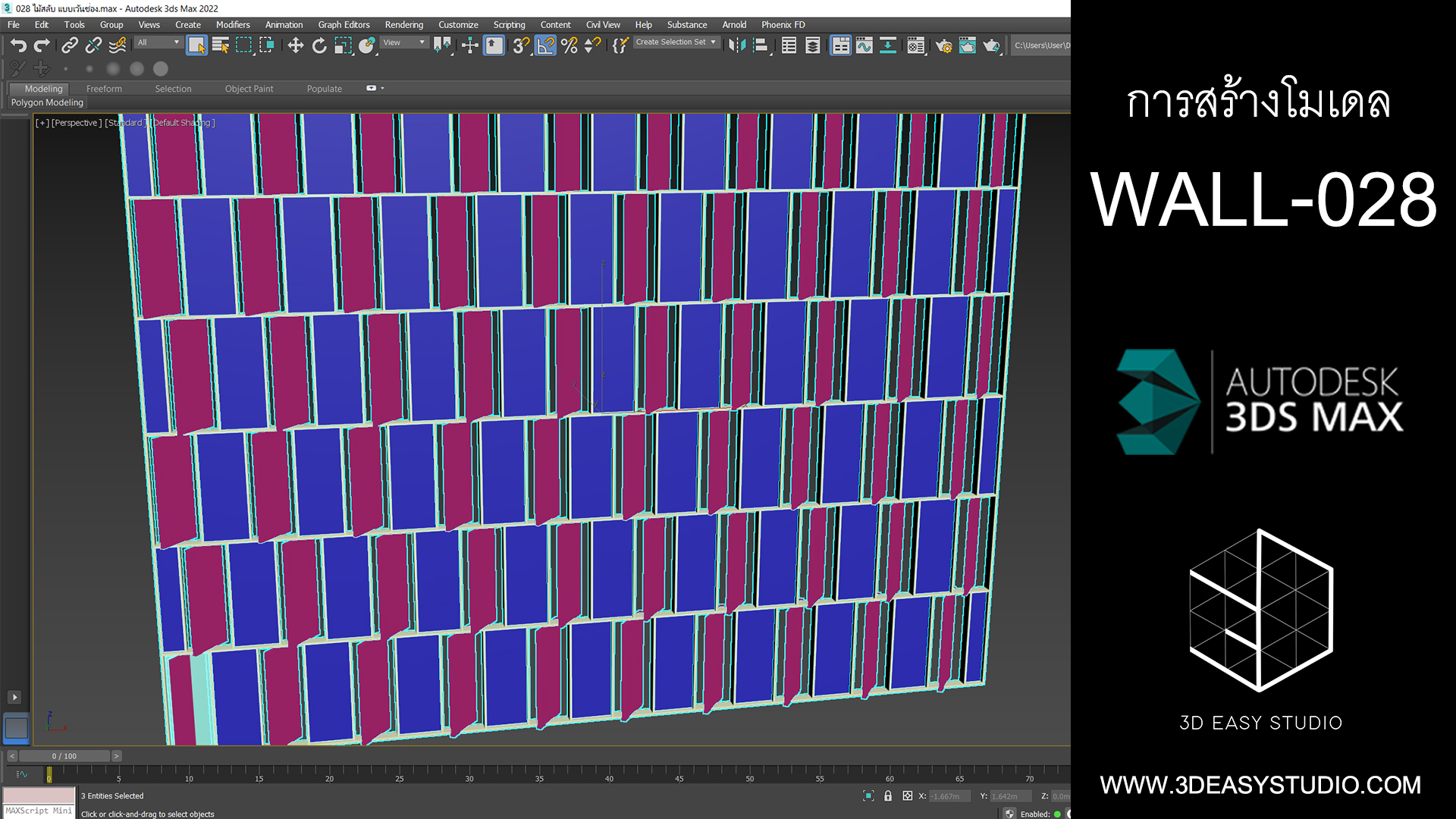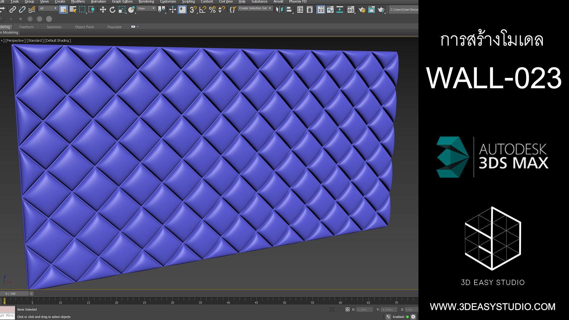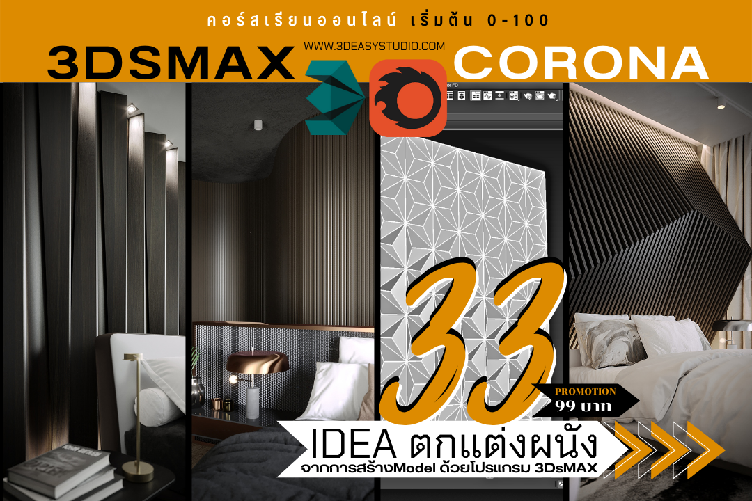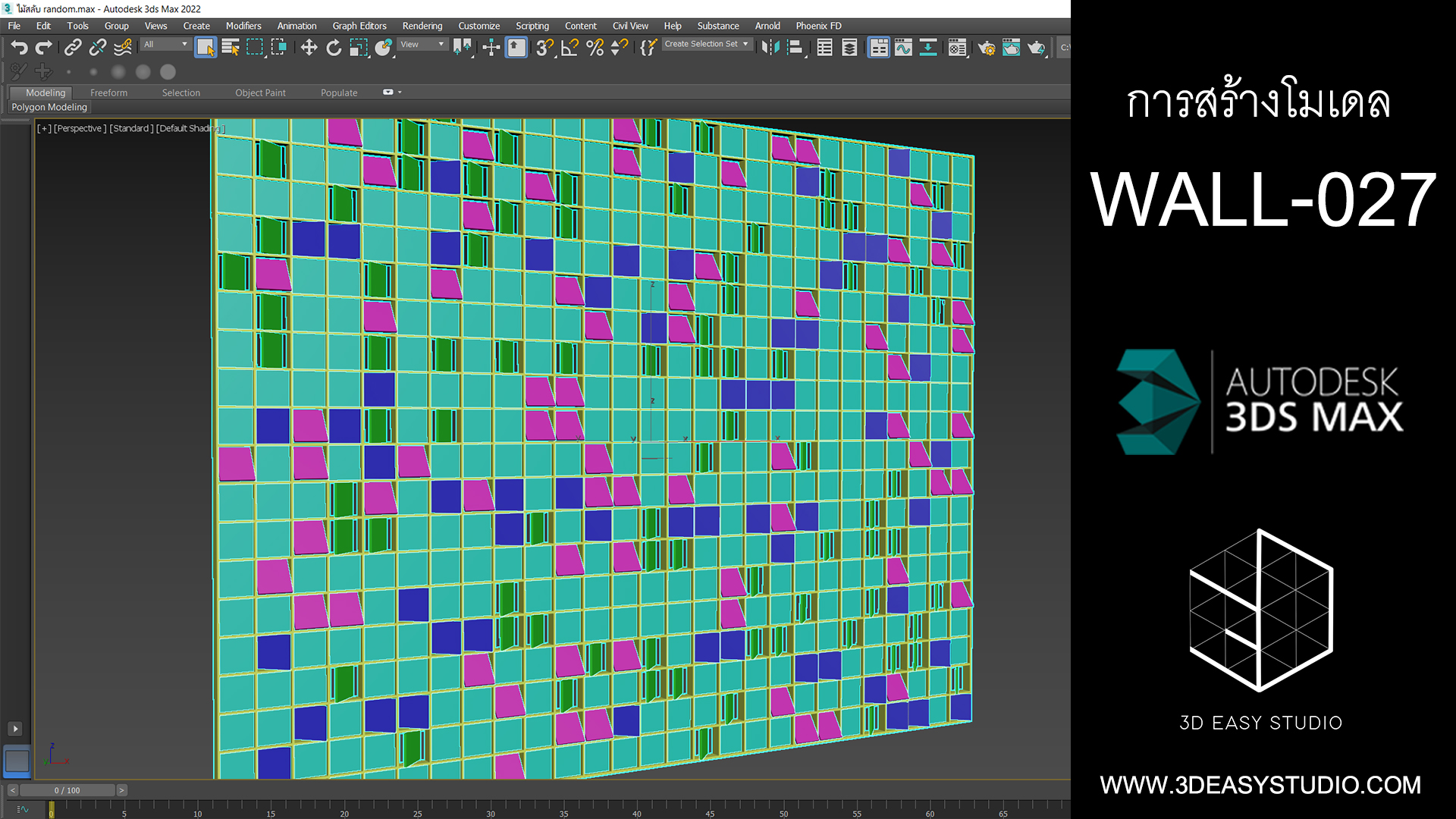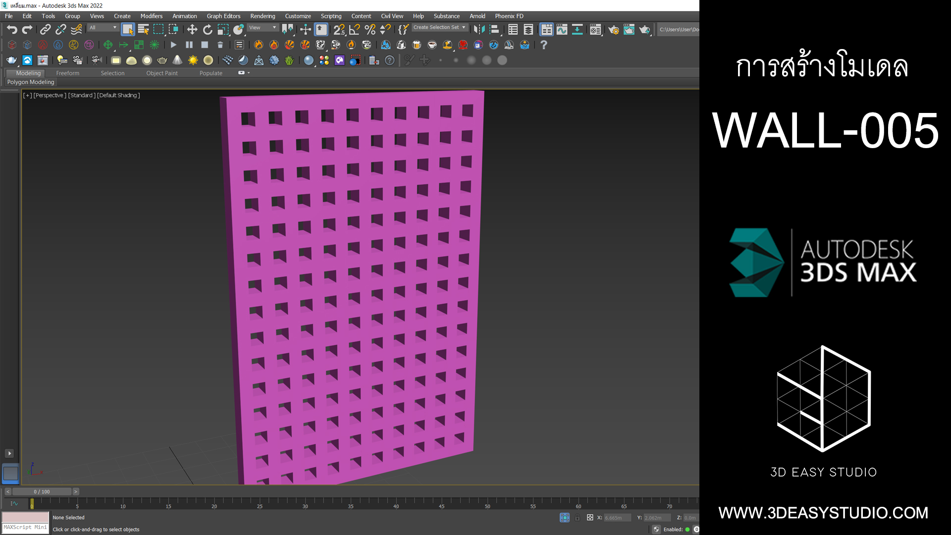 ผนังเว้นช่องสี่เหลี่ยม เล่นระดับขนาดความลึกตื้นได้ด้วยเทคนิคพิเศษ และสามารถปรับความกว้างยาวของผนังได้ตามต้องการ เสร็จแล้วสามารถใส่ Material สีสัน และ Texture ได้ตามต้องการ