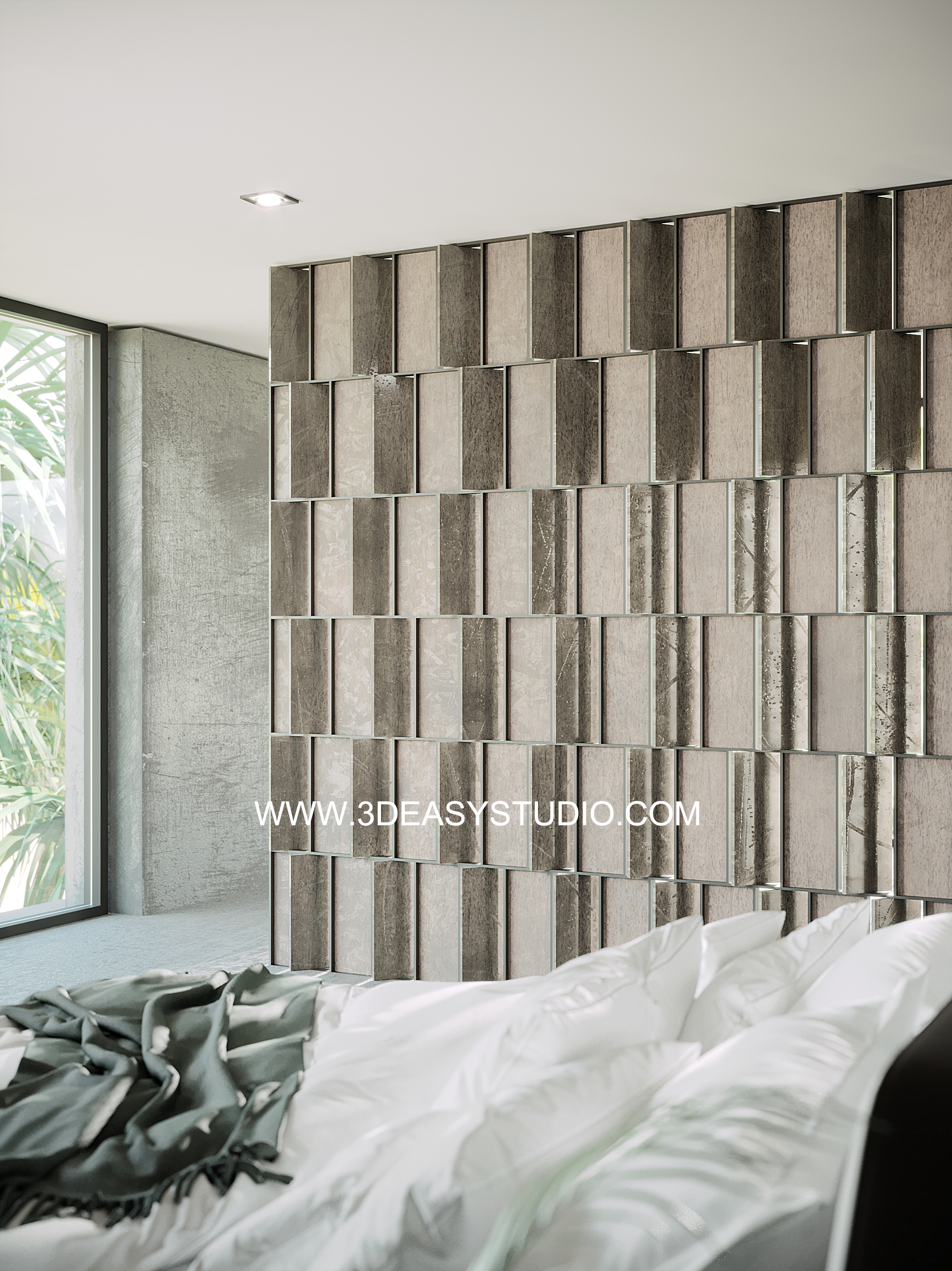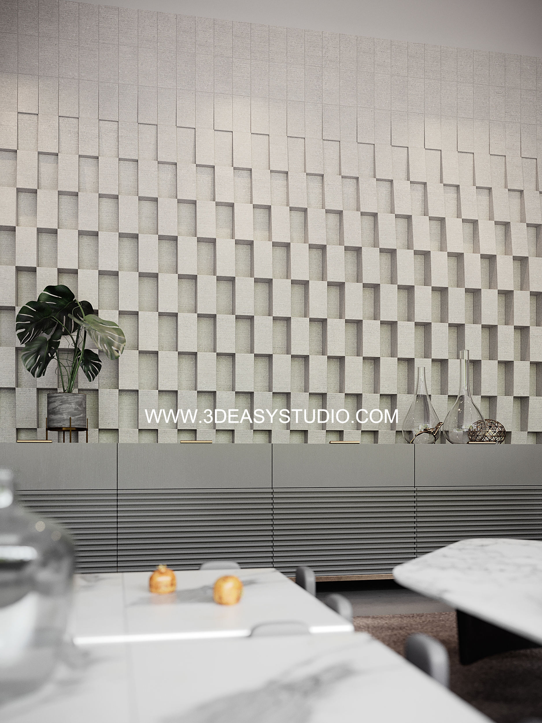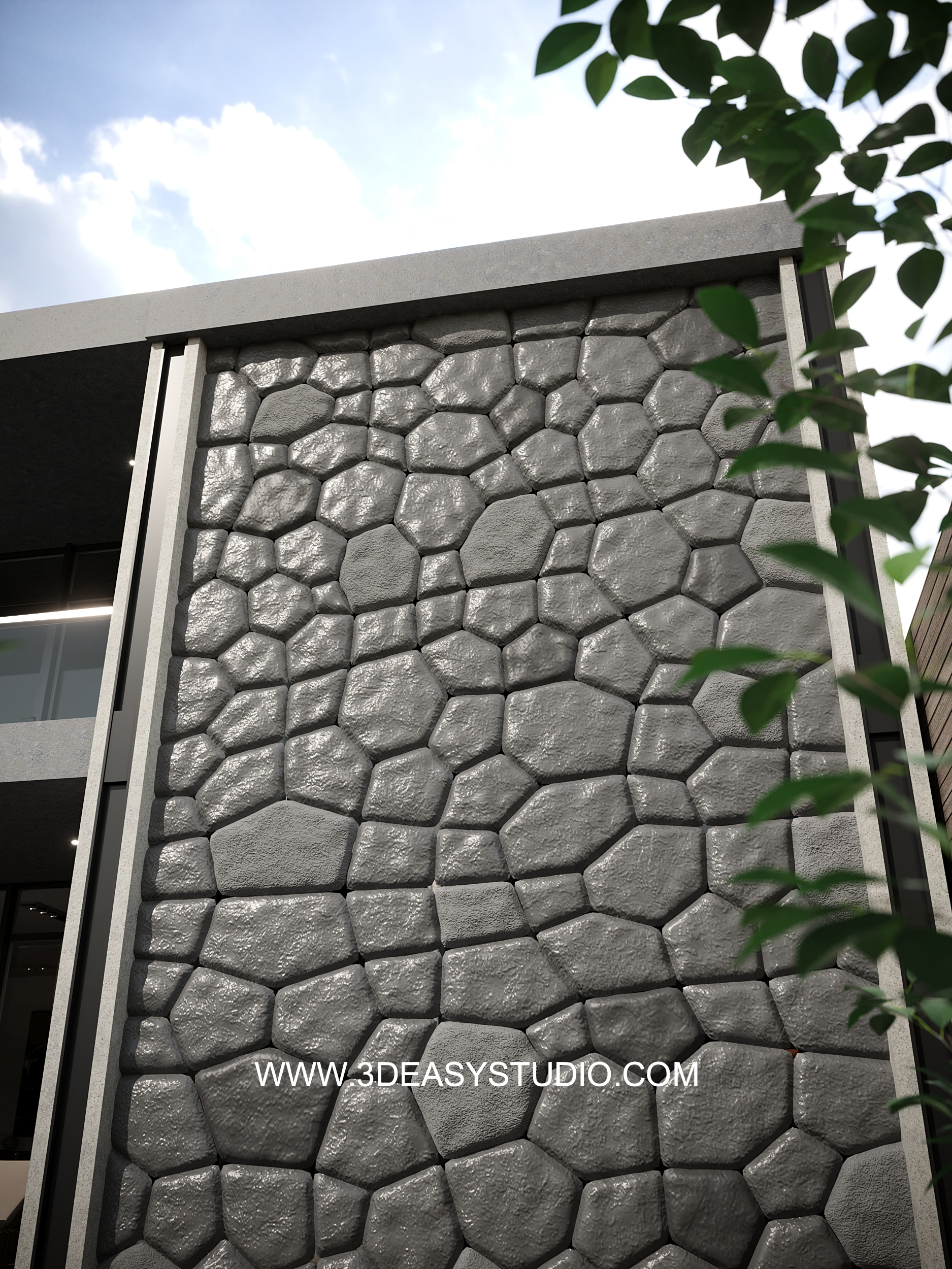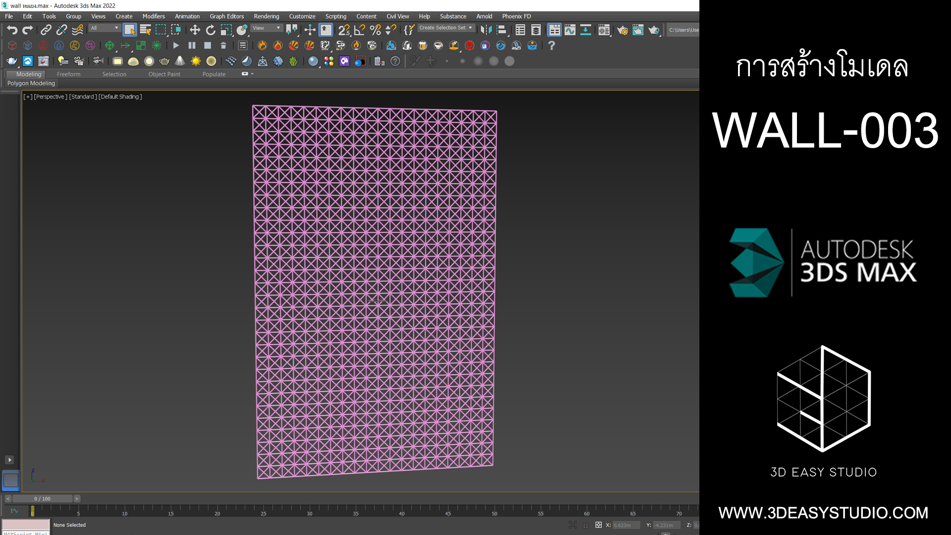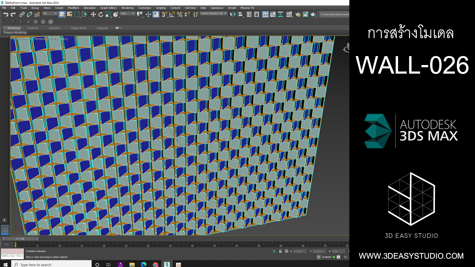 ผนังเว้นช่องสี่เหลี่ยม เล่นระดับขนาดความลึกตื้นได้ด้วยเทคนิคพิเศษ และสามารถปรับความกว้างยาวของผนังได้ตามต้องการ เสร็จแล้วสามารถใส่ Material สีสัน และ Texture ได้ตามต้องการ