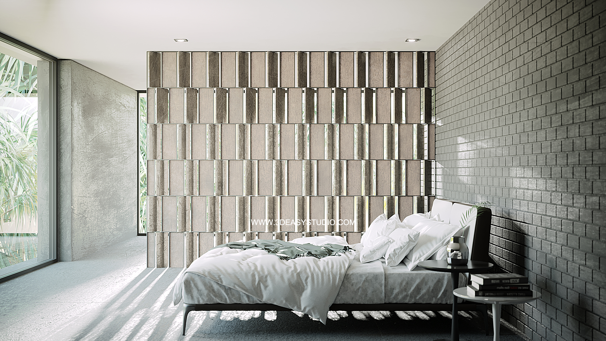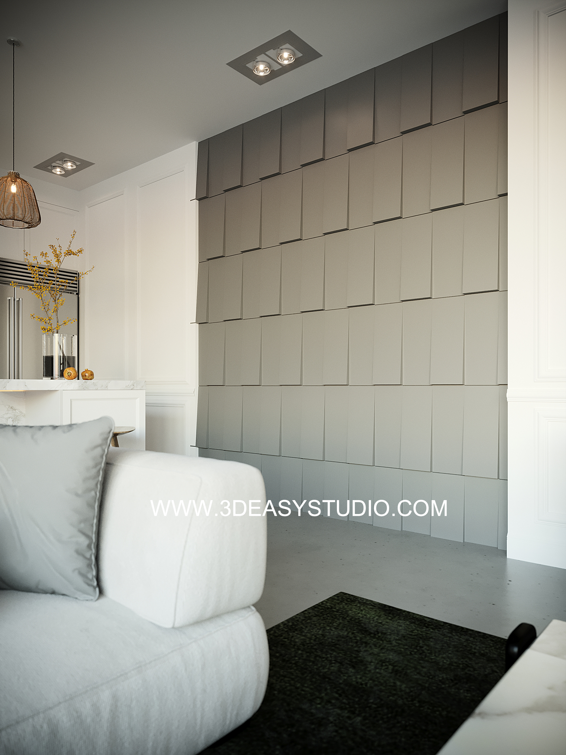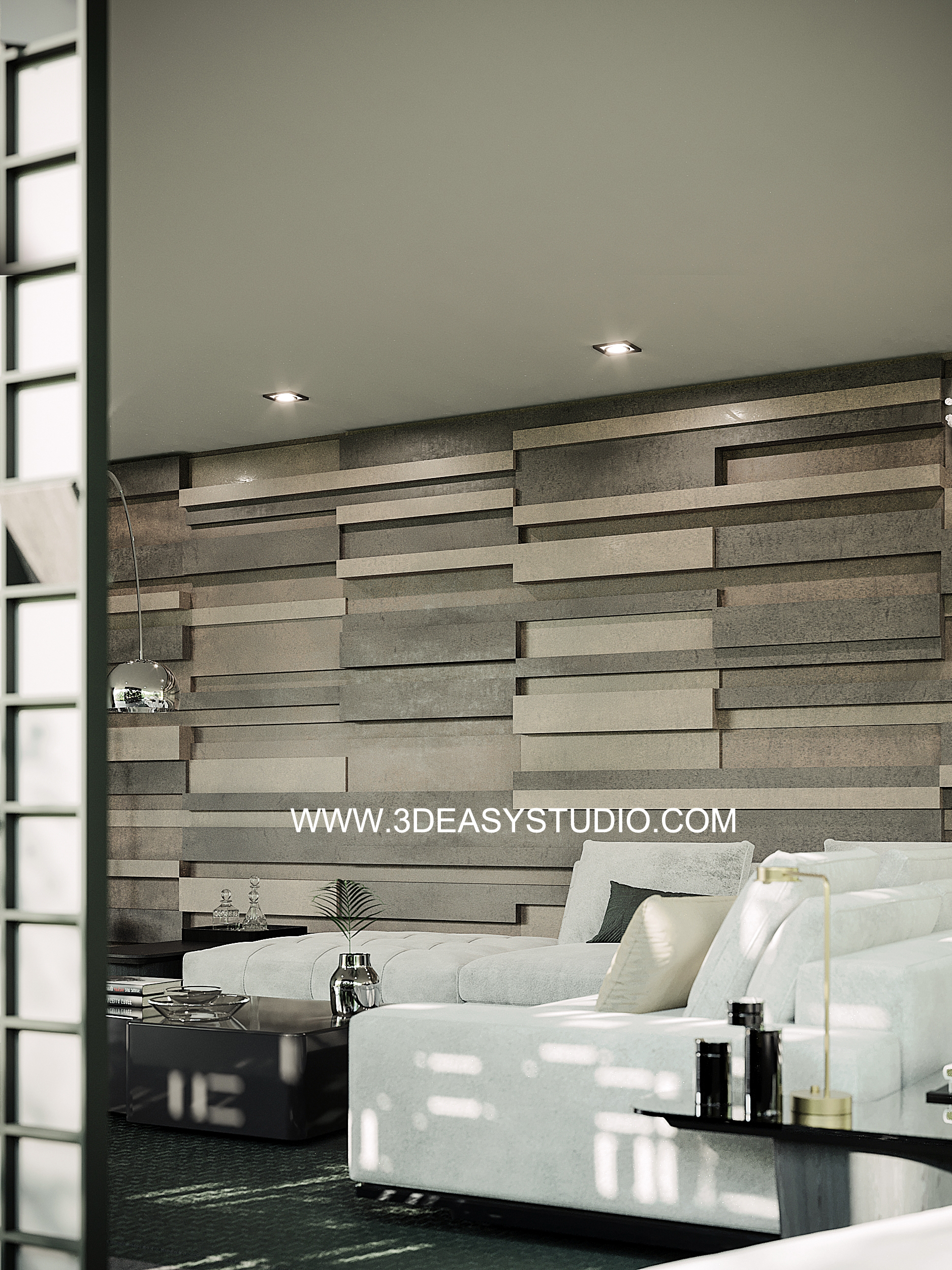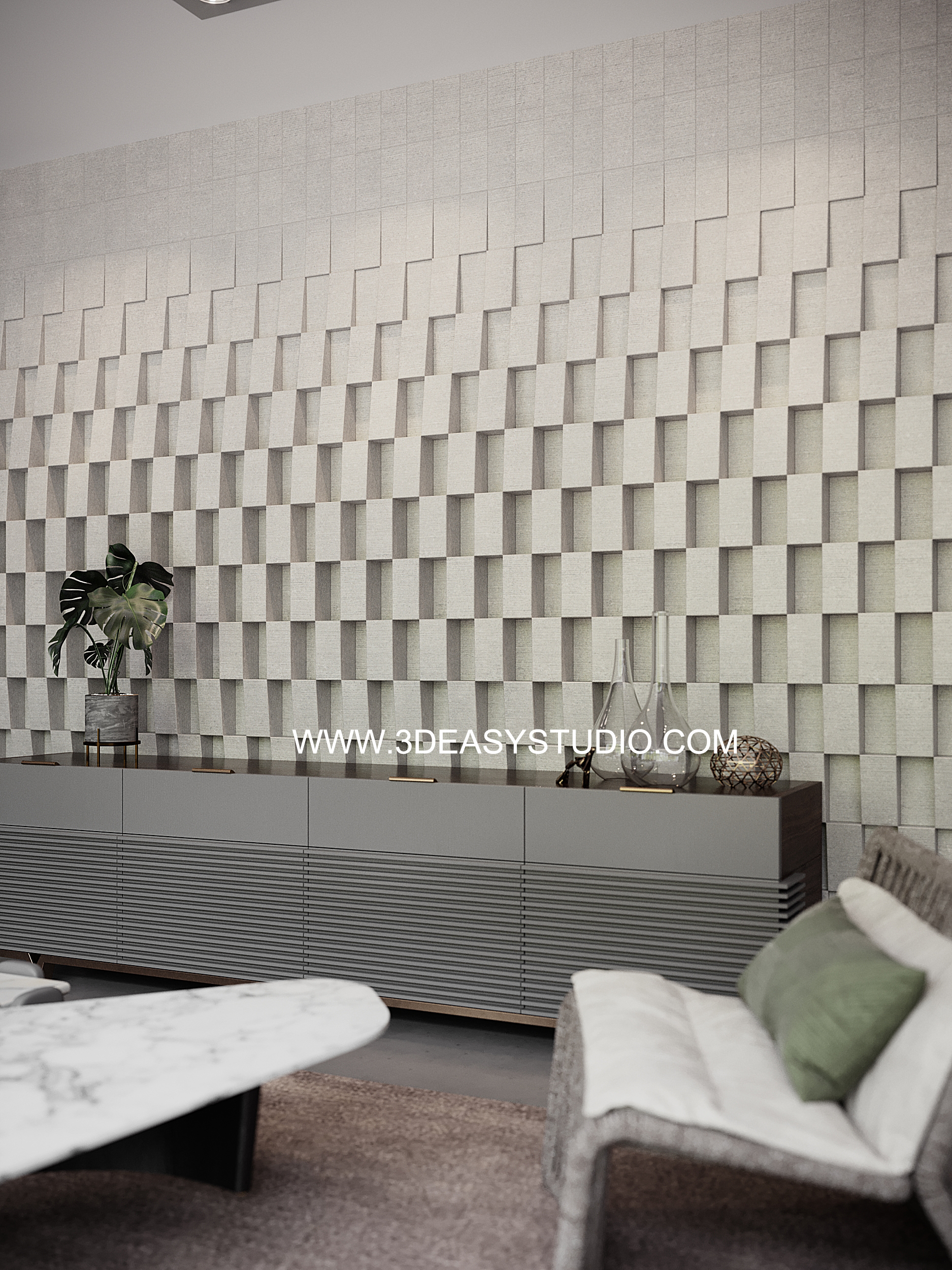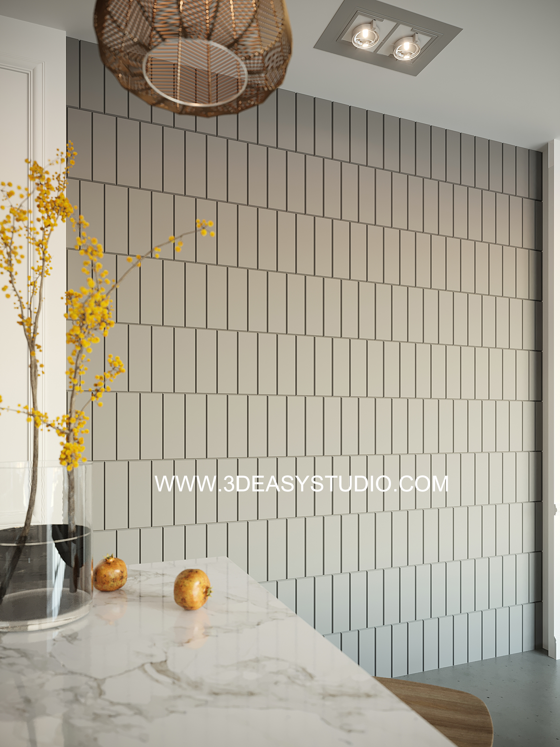 ผนังเว้นช่องสี่เหลี่ยม เล่นระดับขนาดความลึกตื้นได้ด้วยเทคนิคพิเศษ และสามารถปรับความกว้างยาวของผนังได้ตามต้องการ เสร็จแล้วสามารถใส่ Material สีสัน และ Texture ได้ตามต้องการ