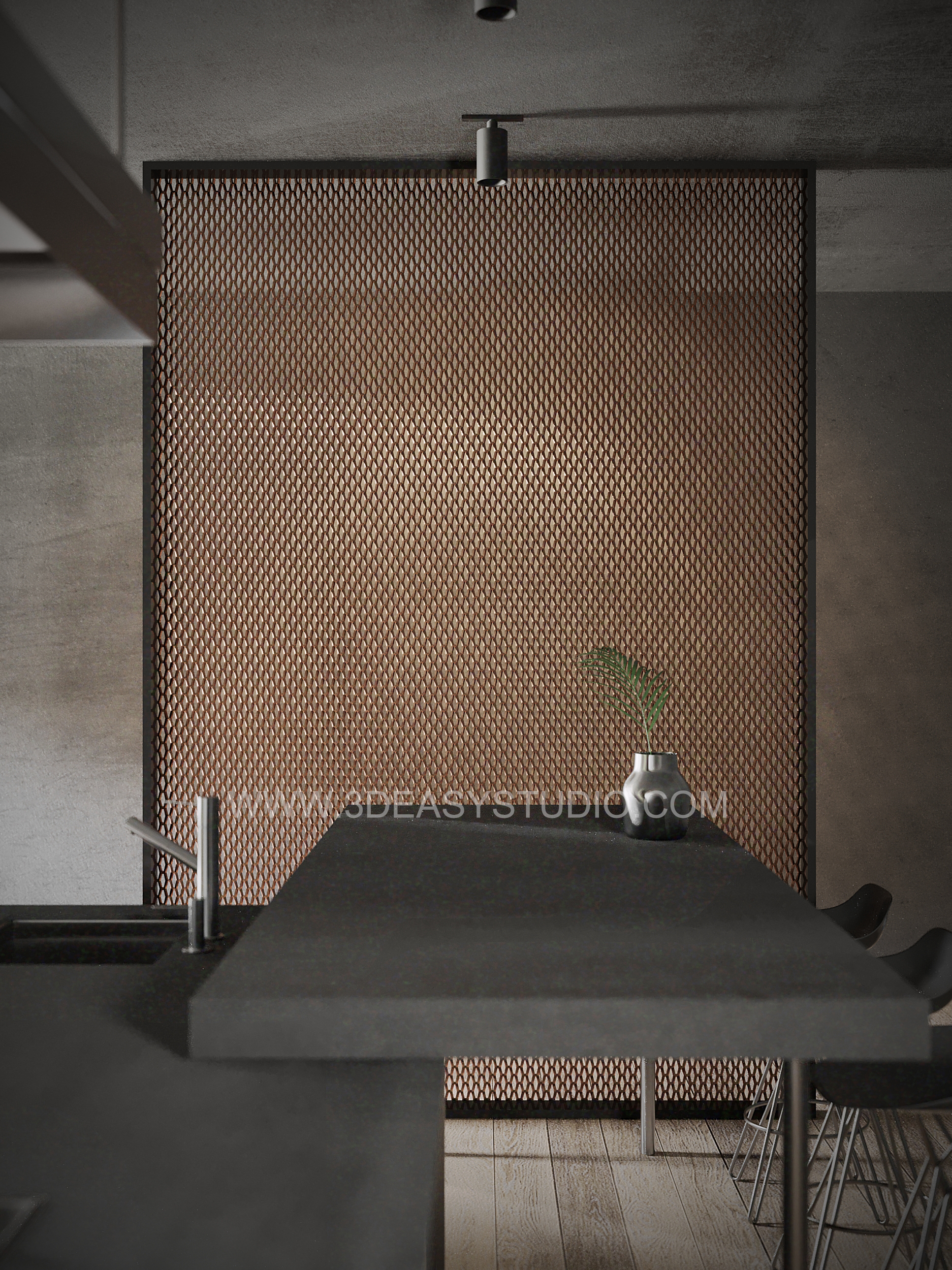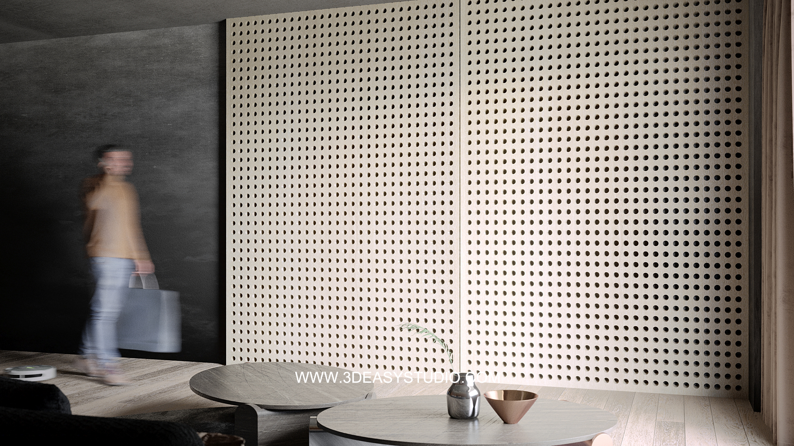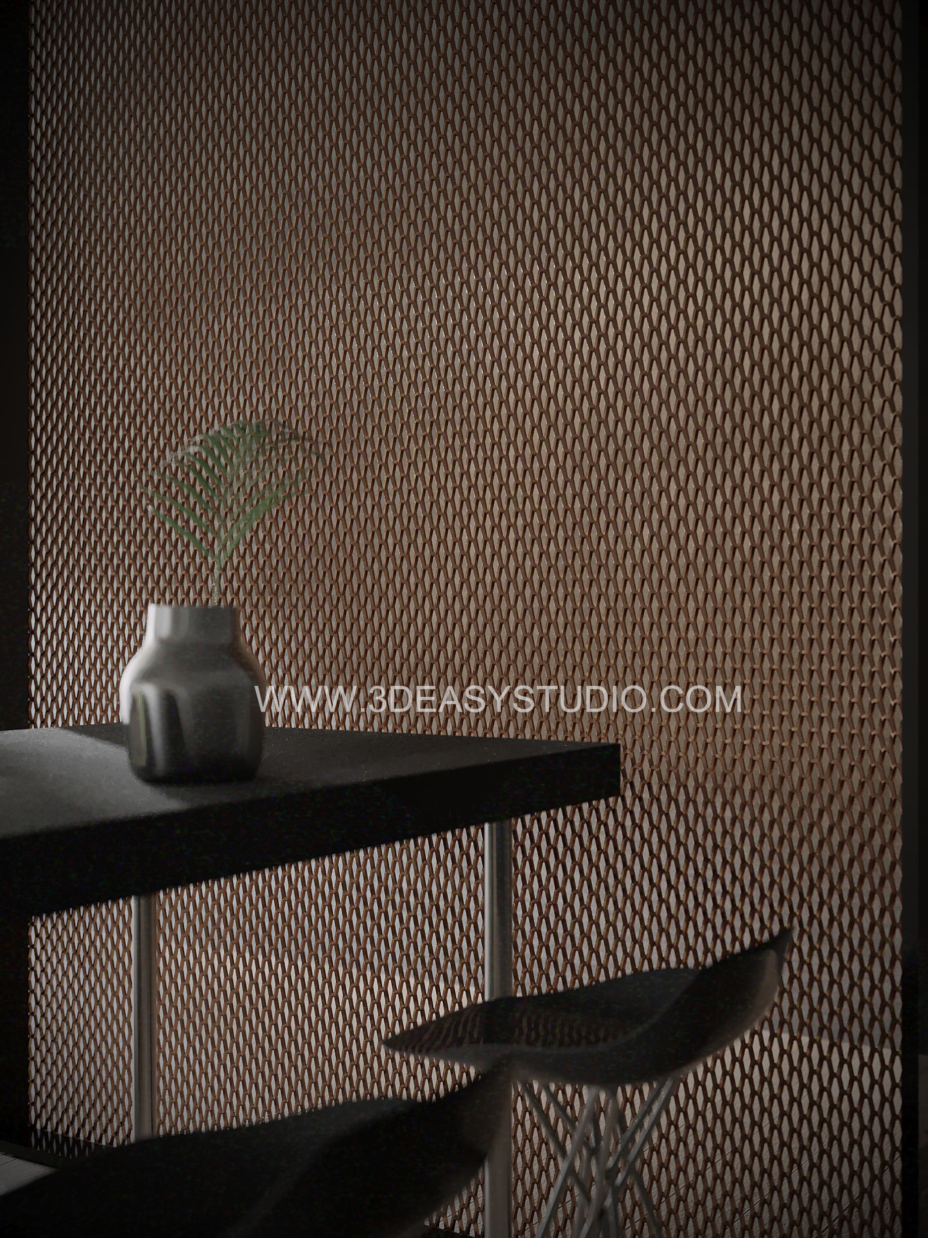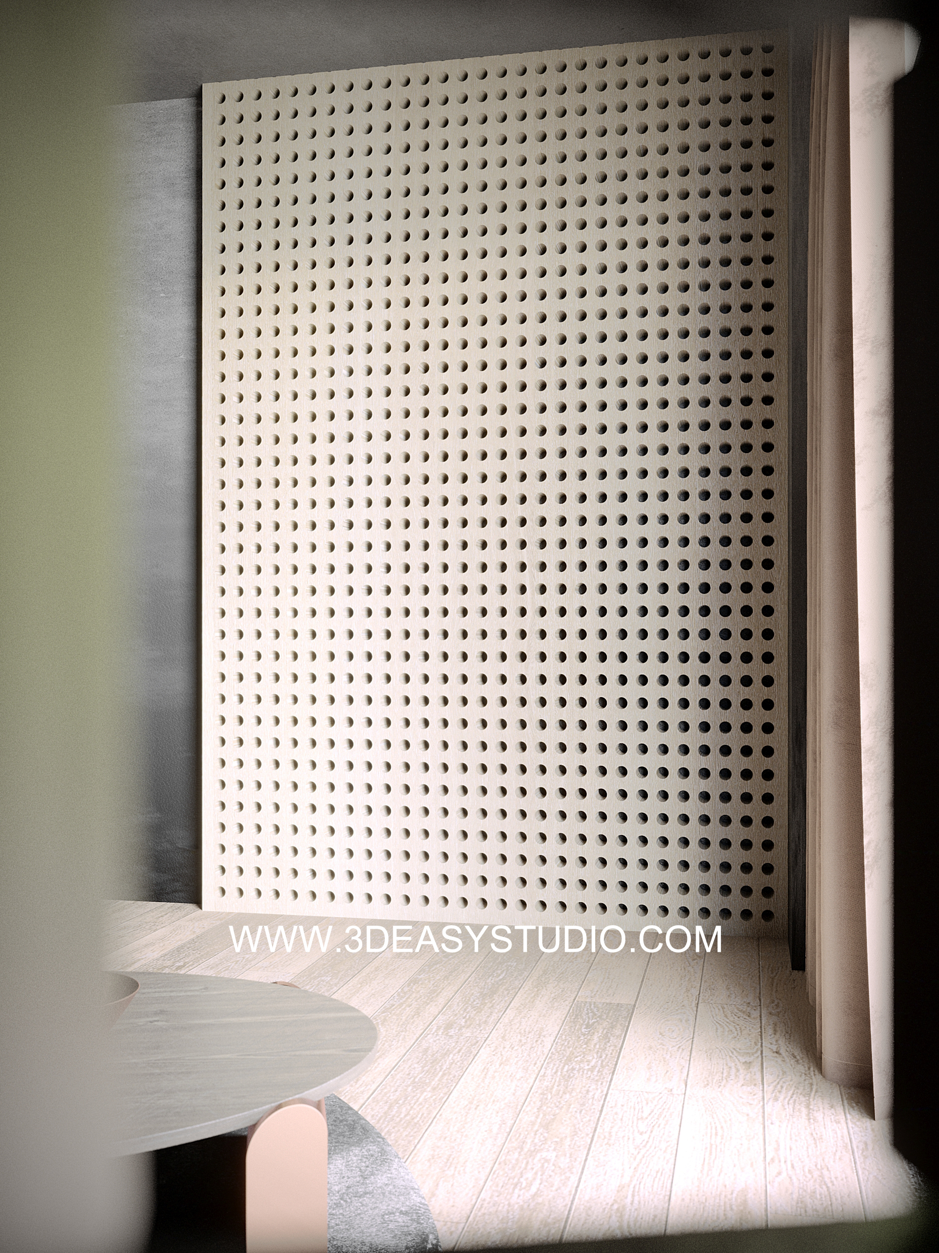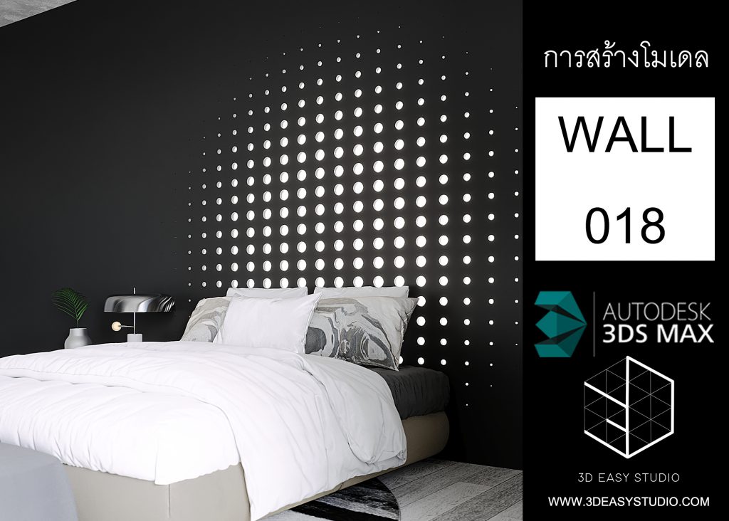 ผนังลวดลายเจาะช่วงวงกลม ไล่ระดับขนาดช่องเล็กใหญ่และปรับตำแหน่งทิศทางได้ด้วยเทคนิคพิเศษ และสามารถปรับความกว้างยาวของผนังได้ตามต้องการ เสร็จแล้วสามารถใส่ Material สีสัน และ Texture ได้ตามต้องการ