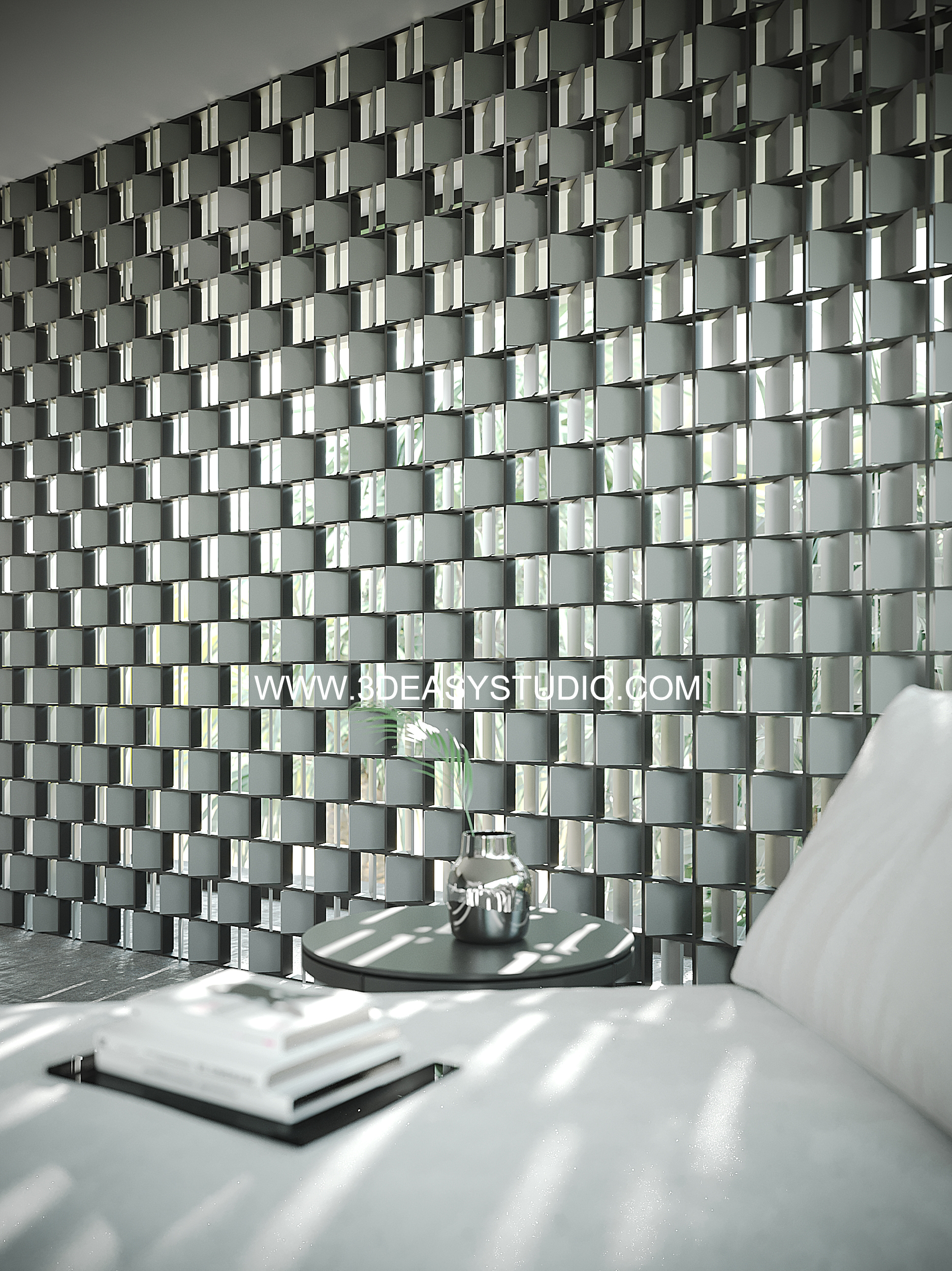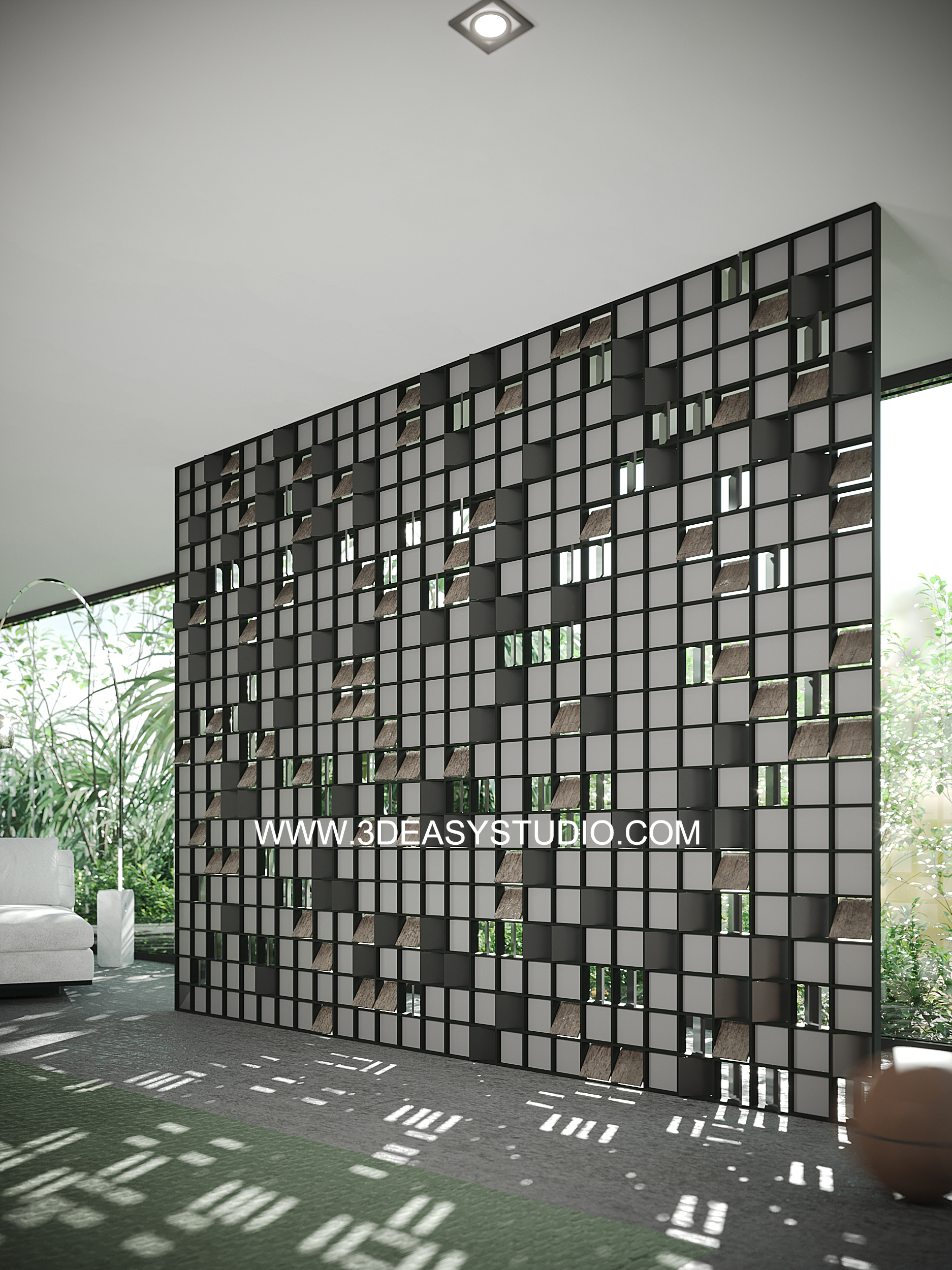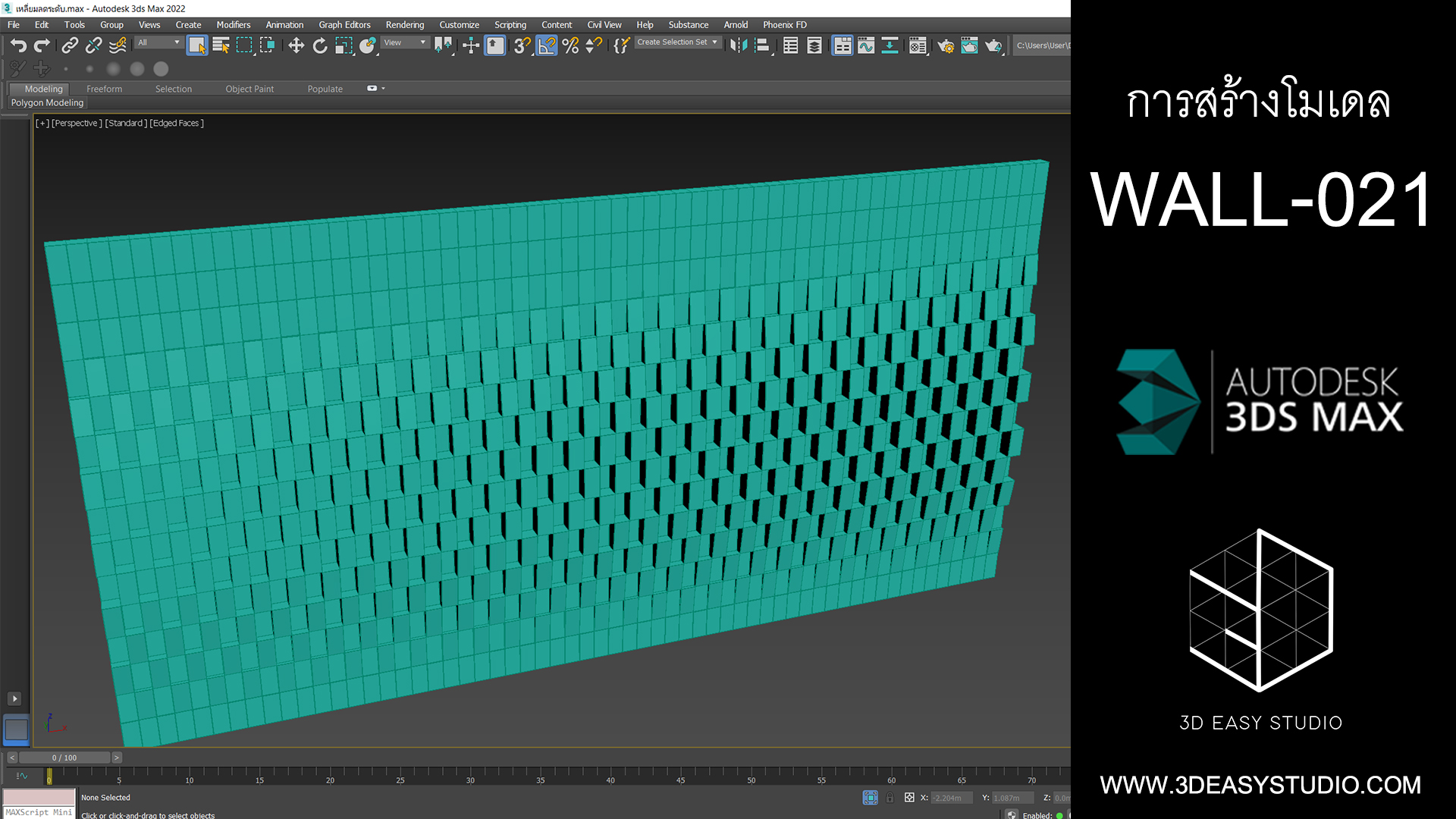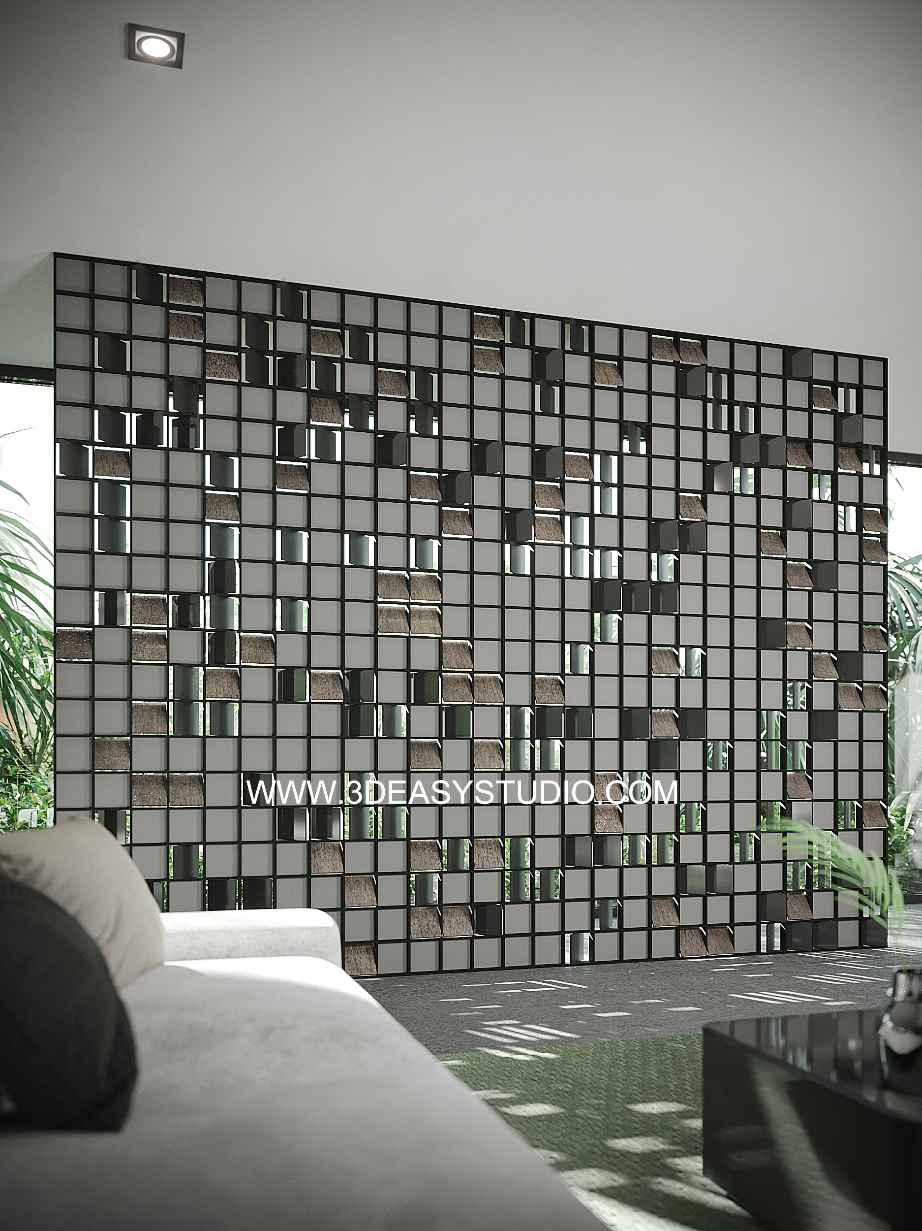ผนังเจาะช่องสี่เหลี่ยม ไล่ระดับขนาดช่องเล็กใหญ่และปรับตำแหน่งทิศทางรูปแบบต่างๆ ได้ด้วยเทคนิคพิเศษ และสามารถปรับความกว้างยาวของผนังได้ตามต้องการ เสร็จแล้วสามารถใส่ Material สีสัน และ Texture ได้ตามต้องการ
