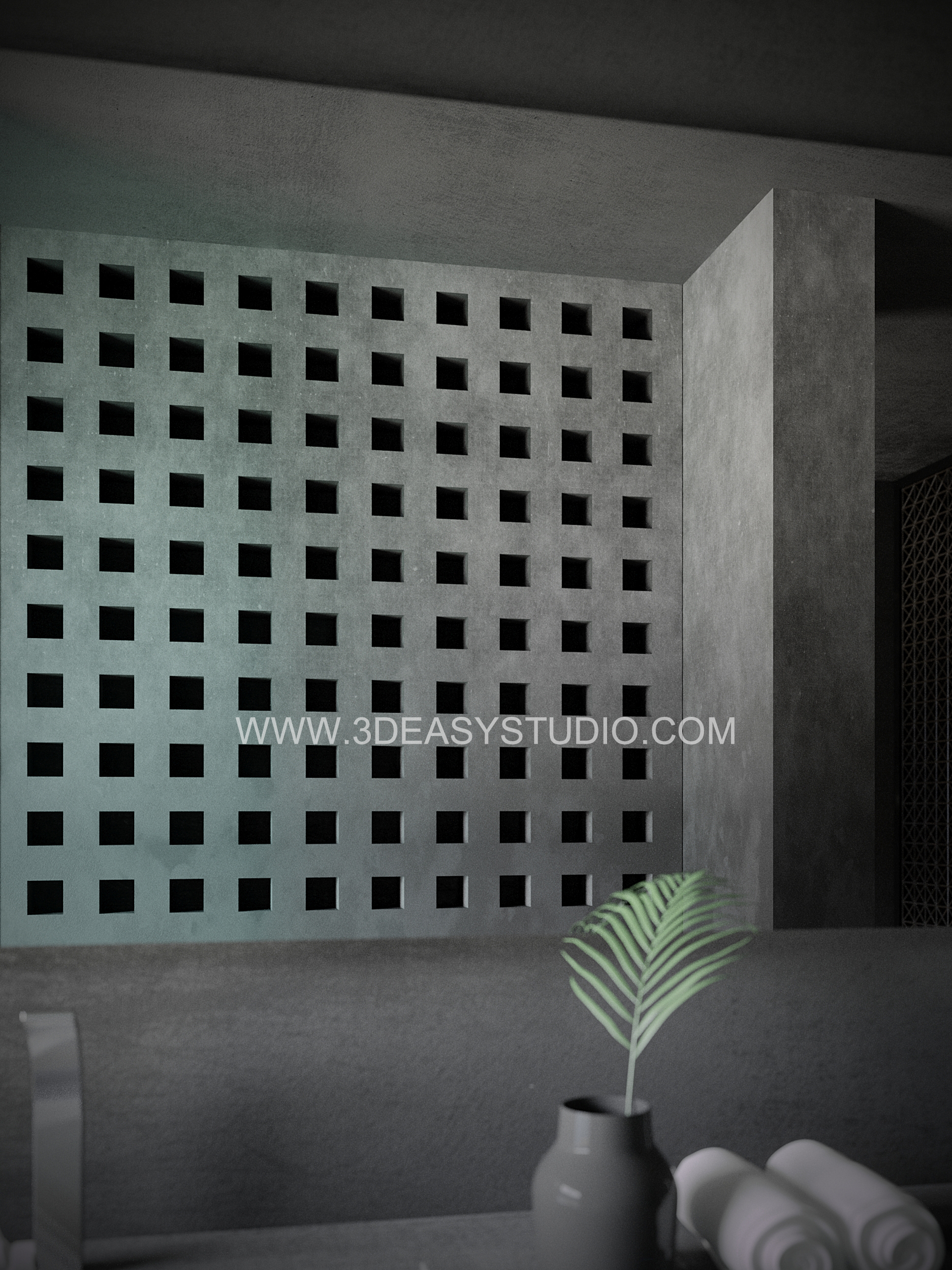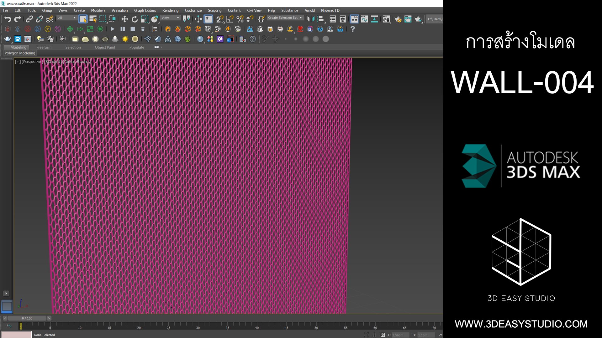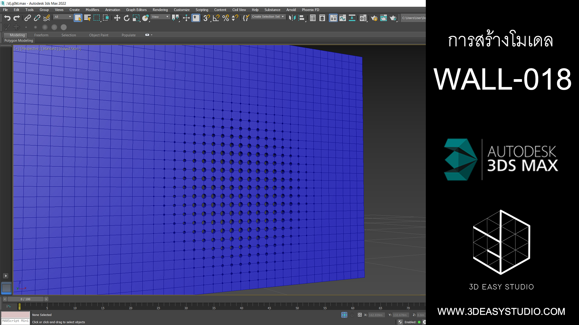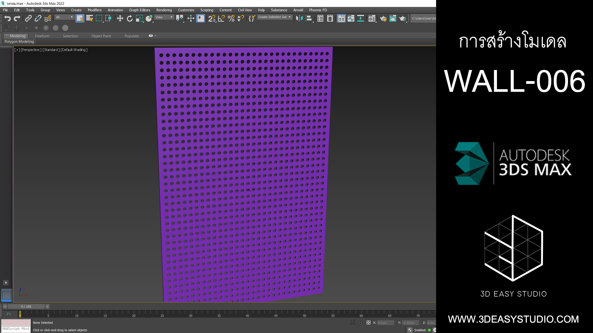 ผนังเจาะช่องสี่เหลี่ยม ไล่ระดับขนาดช่องเล็กใหญ่และปรับตำแหน่งทิศทางรูปแบบต่างๆ ได้ด้วยเทคนิคพิเศษ และสามารถปรับความกว้างยาวของผนังได้ตามต้องการ เสร็จแล้วสามารถใส่ Material สีสัน และ Texture ได้ตามต้องการ
