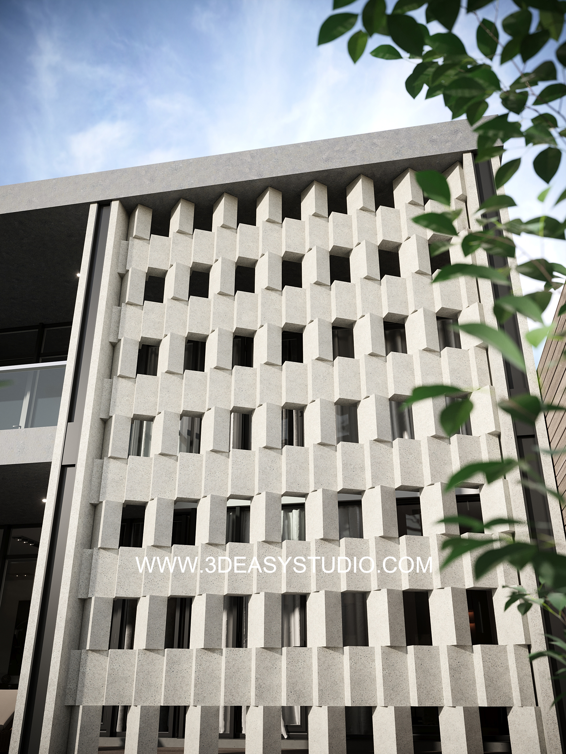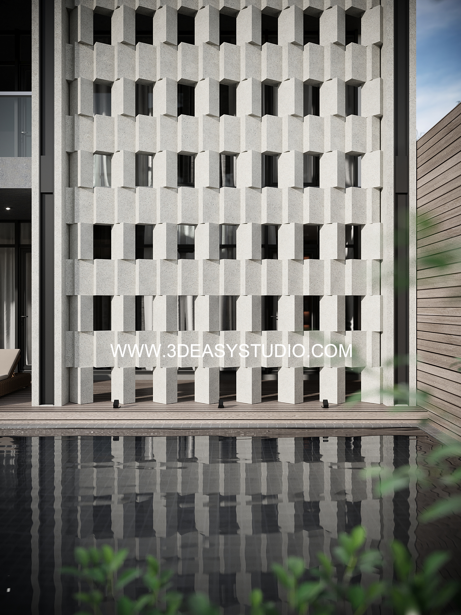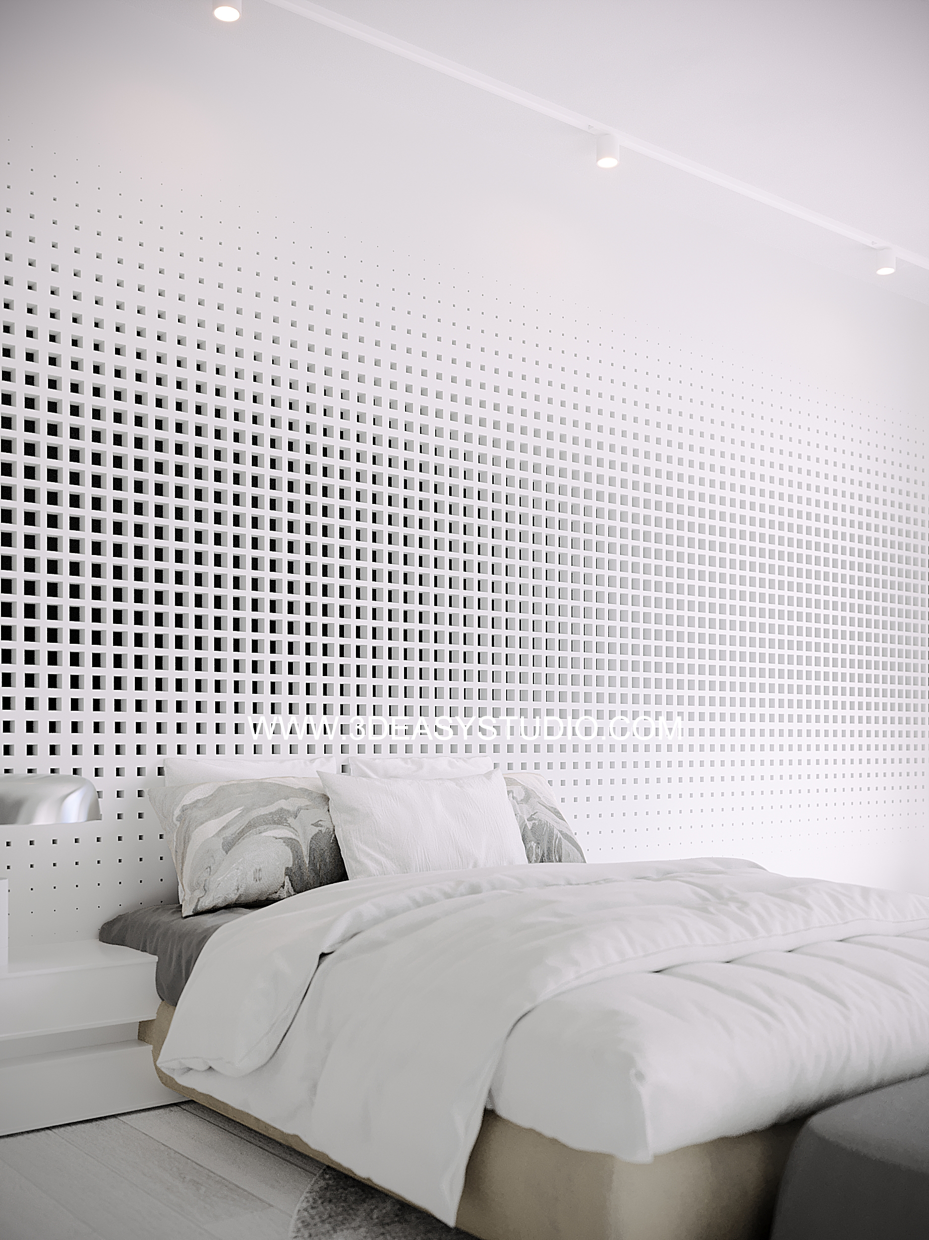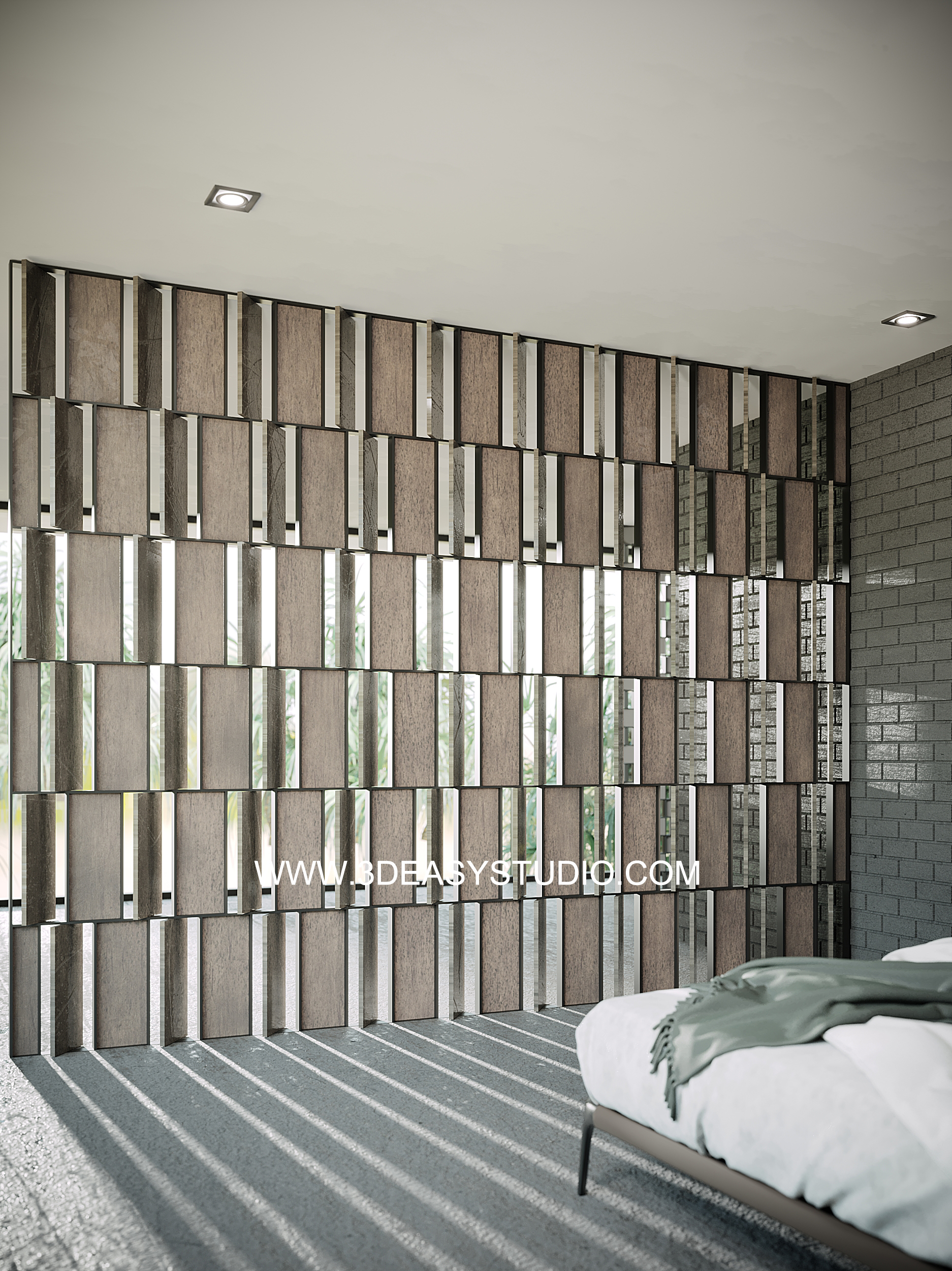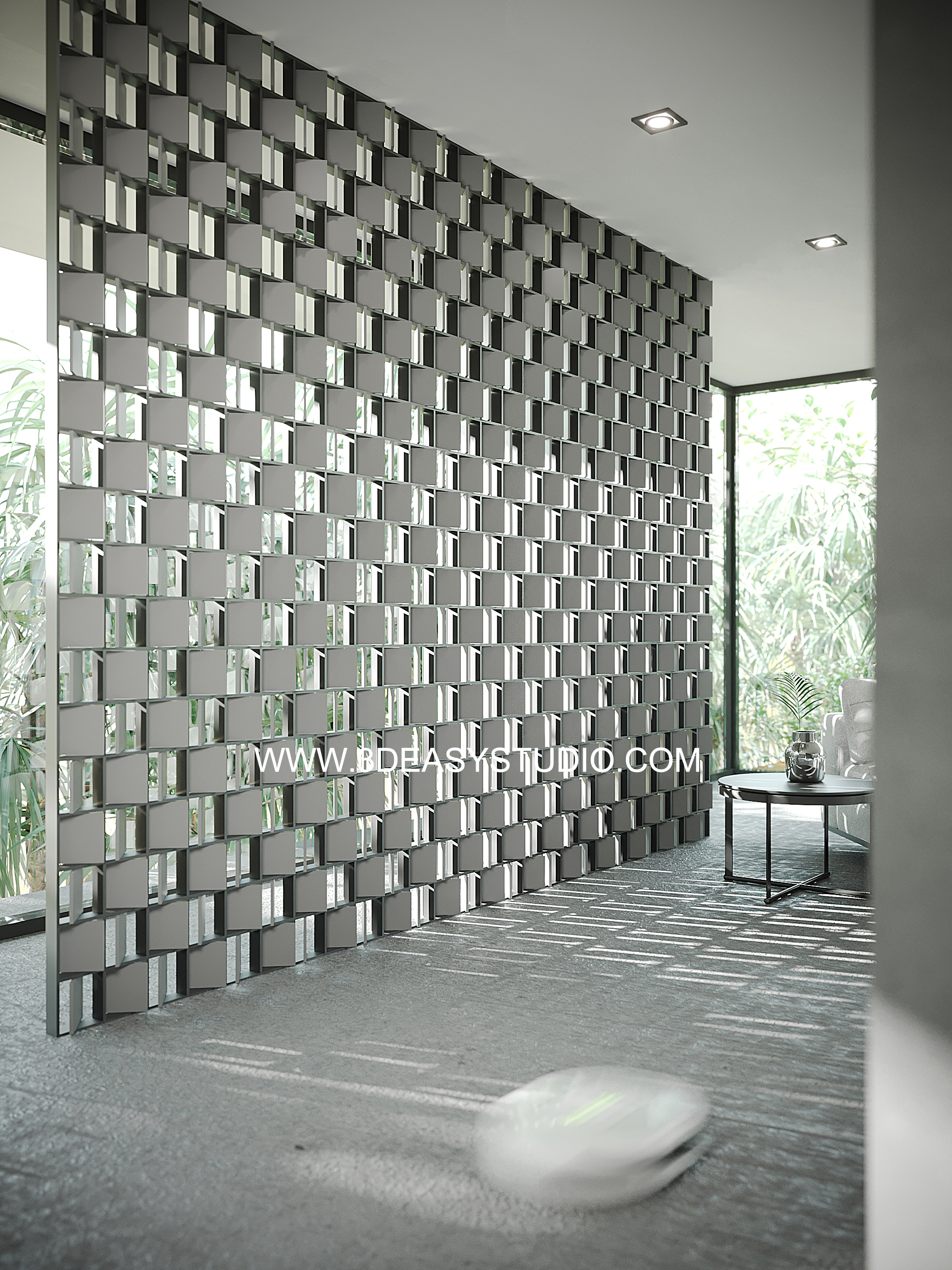 ผนังเจาะช่องสี่เหลี่ยม ไล่ระดับขนาดช่องเล็กใหญ่และปรับตำแหน่งทิศทางรูปแบบต่างๆ ได้ด้วยเทคนิคพิเศษ และสามารถปรับความกว้างยาวของผนังได้ตามต้องการ เสร็จแล้วสามารถใส่ Material สีสัน และ Texture ได้ตามต้องการ