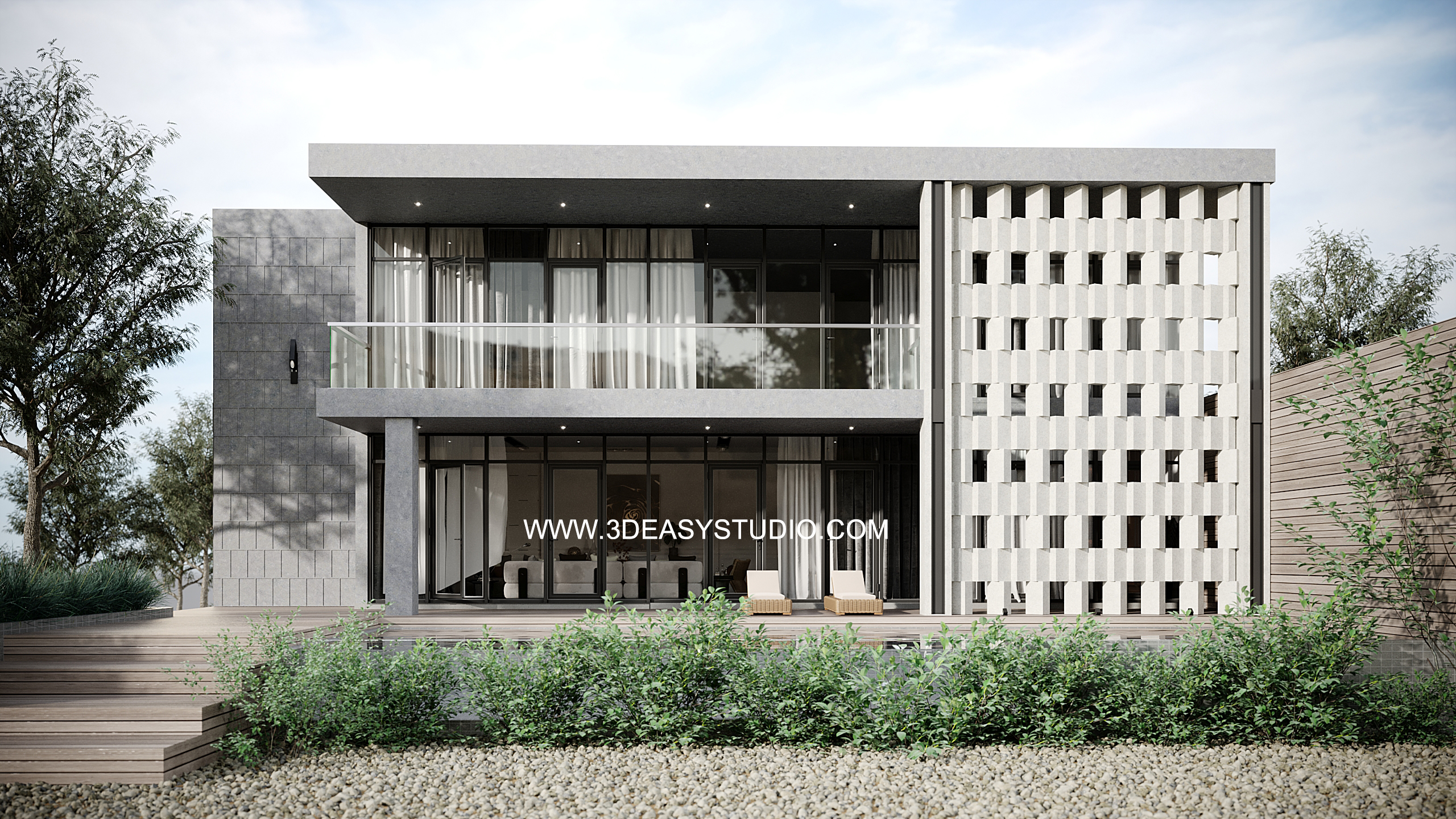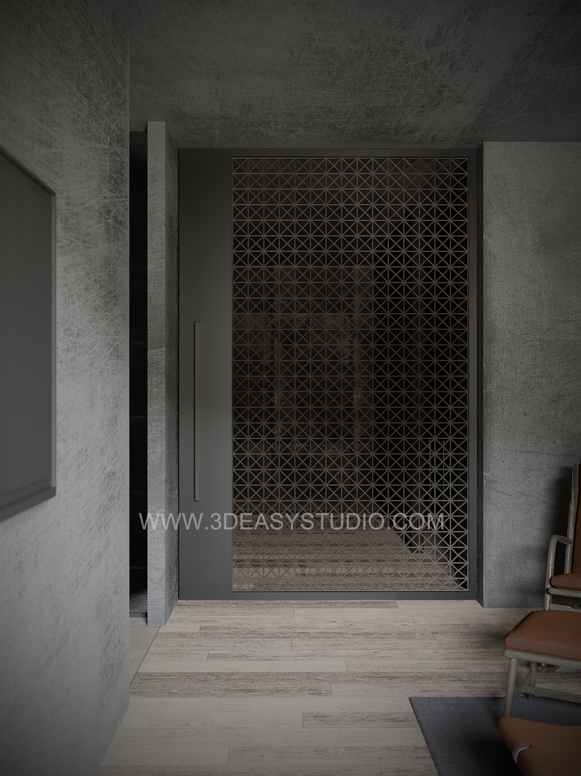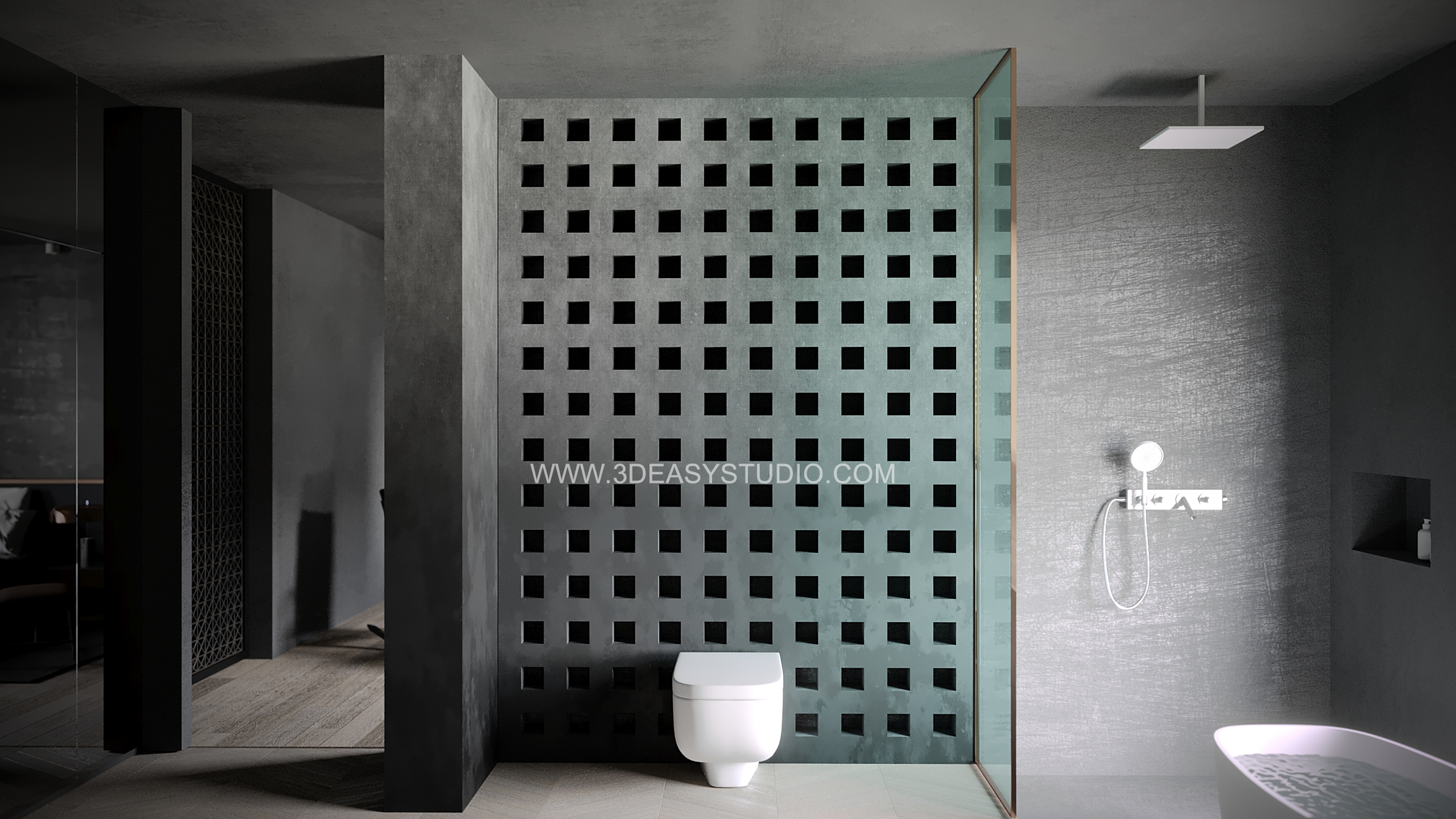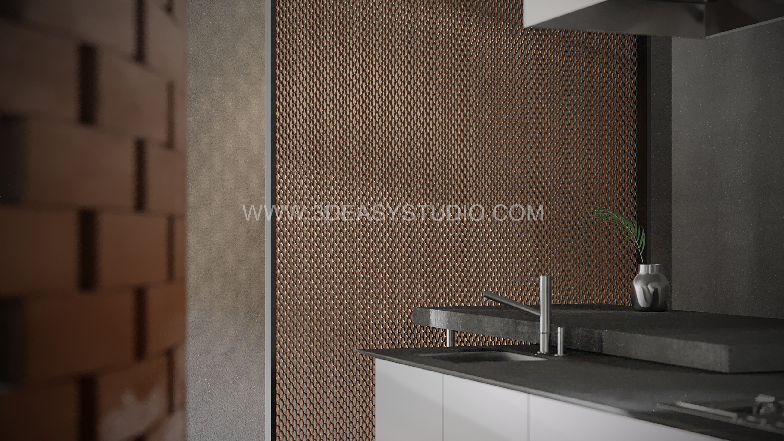 ผนังเจาะช่องสี่เหลี่ยม ไล่ระดับขนาดช่องเล็กใหญ่และปรับตำแหน่งทิศทางรูปแบบต่างๆ ได้ด้วยเทคนิคพิเศษ และสามารถปรับความกว้างยาวของผนังได้ตามต้องการ เสร็จแล้วสามารถใส่ Material สีสัน และ Texture ได้ตามต้องการ