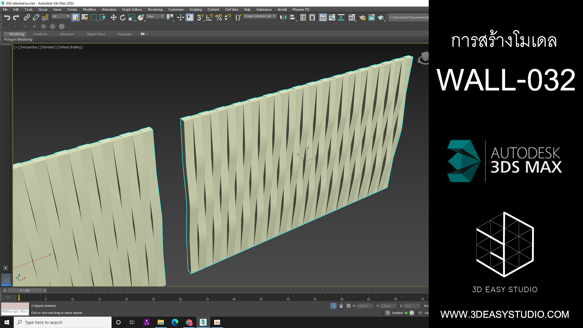 ผนังไม้บิดซ้ายขวาสลับกันได้ทีเดียวไม่ต้องสร้างแยก ปรับกว้างยาวหนาได้ตามต้องการ เสร็จแล้วสามารถใส่ Material แยกสีสัน และ Texture ได้ตามต้องการ