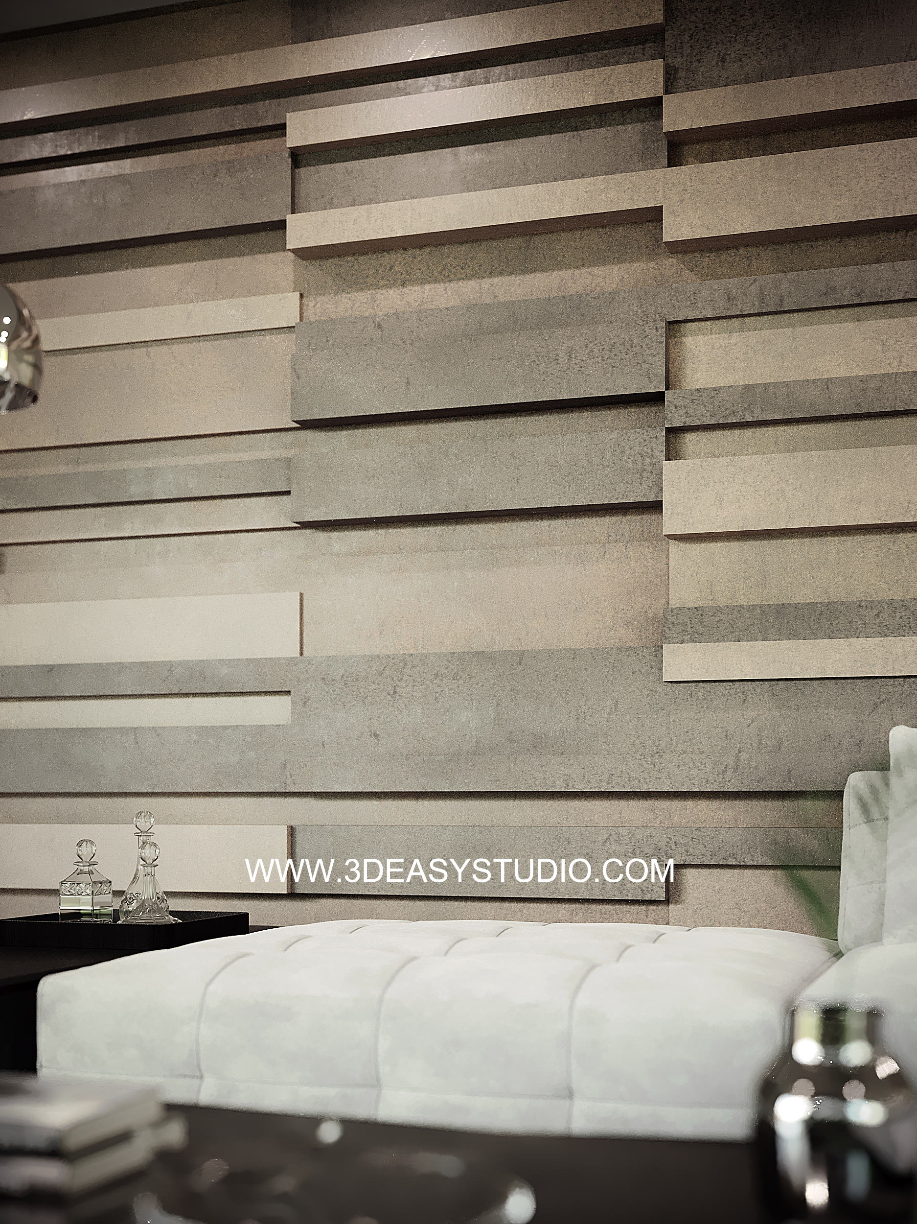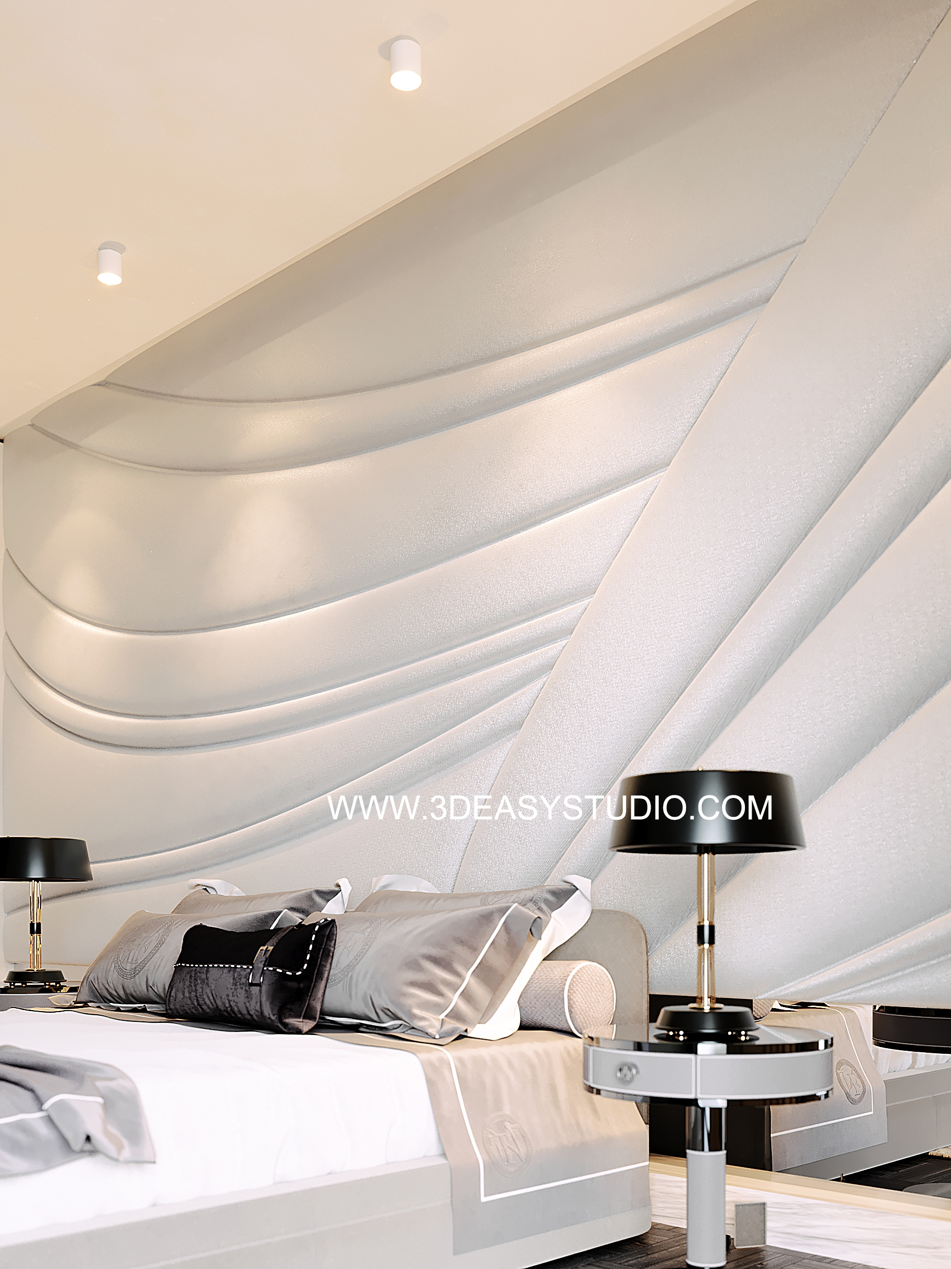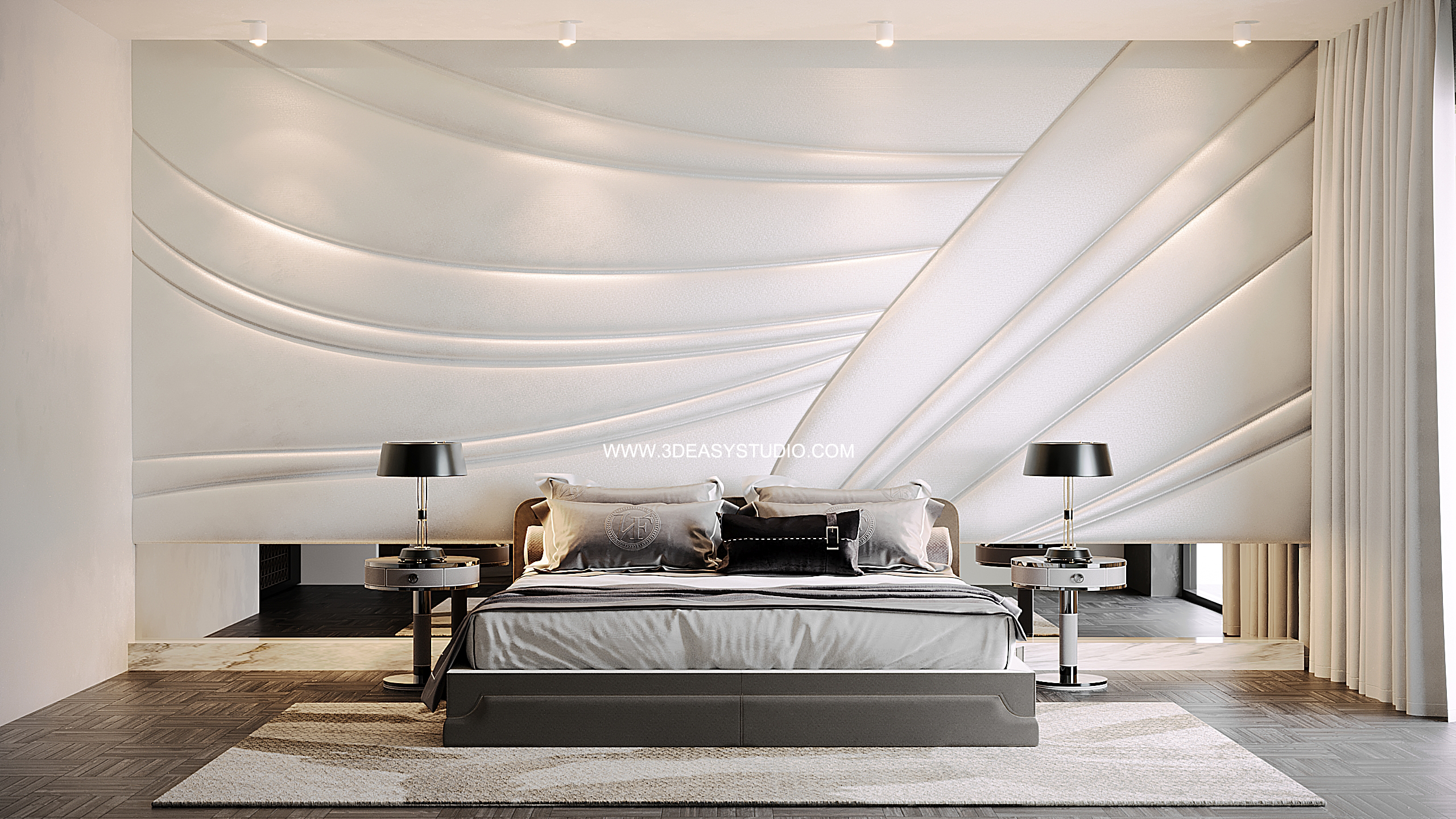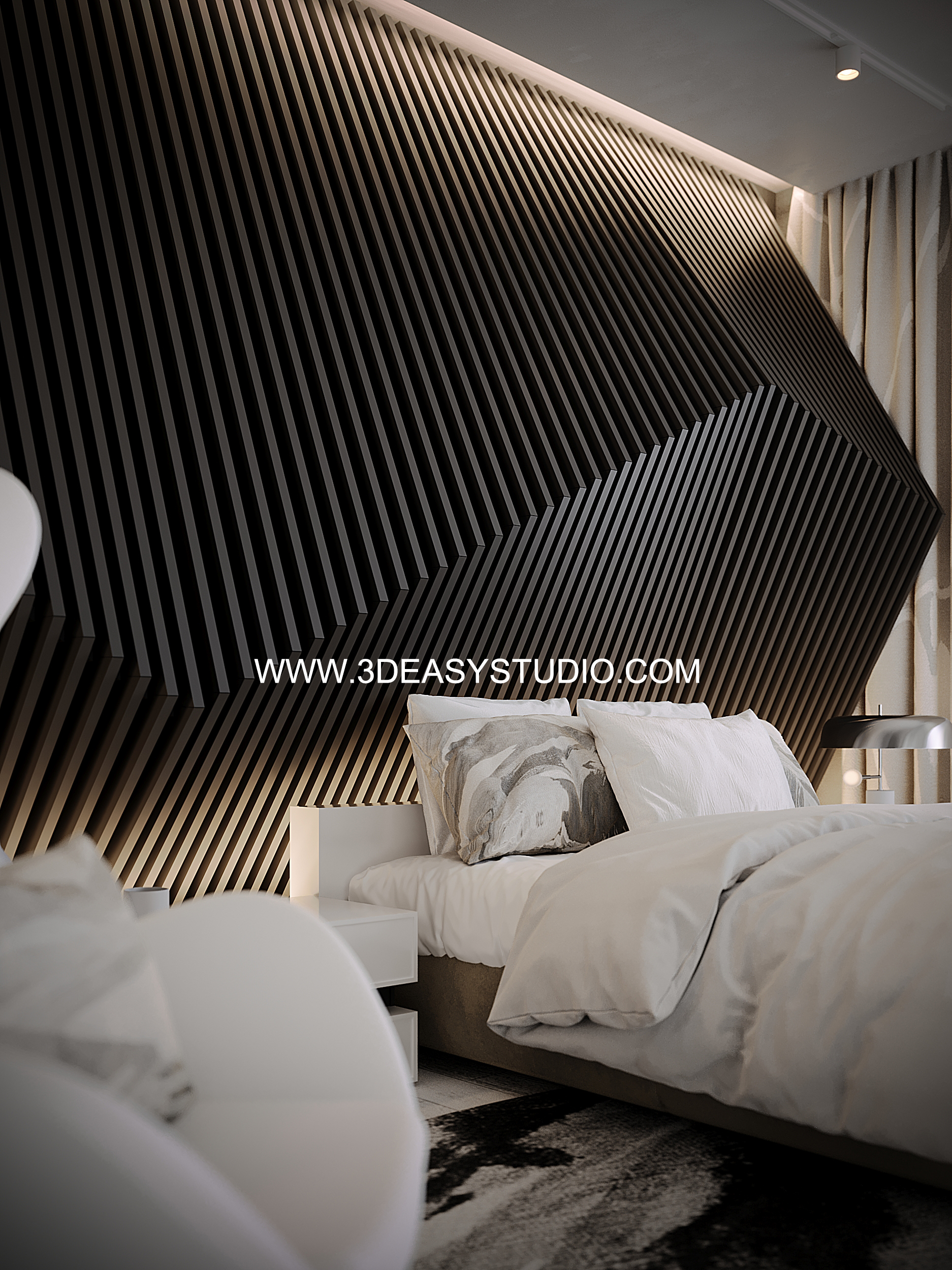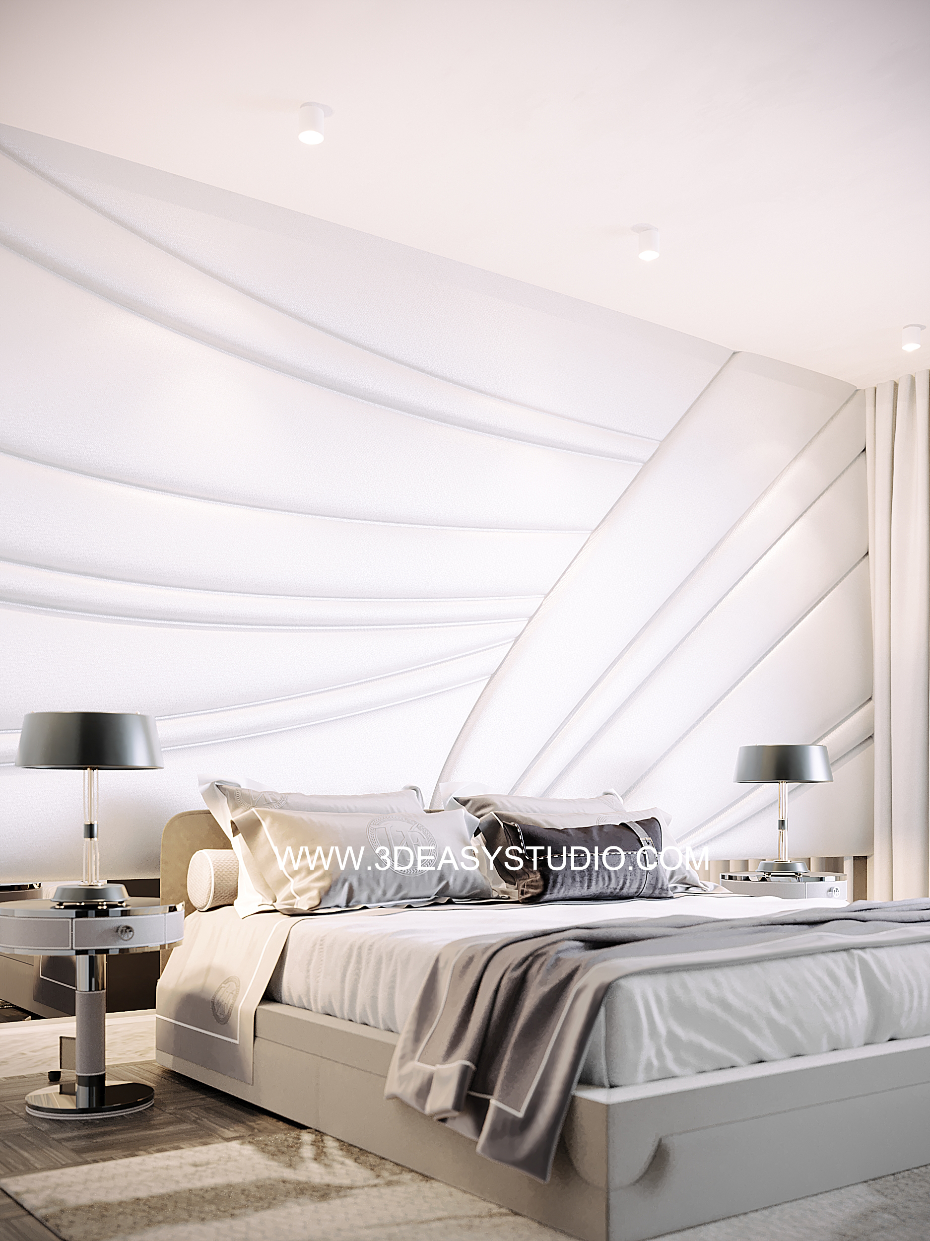 ผนังบุนวมนุ่มๆรูปแบบลายโค้งพริ้วไหว ทั้งแผ่นเป็นชิ้นเดียวกัน ปรับระยะความหนาของเบาะ ปรับรอยดึงเย็บและขนาดความกว้างยาว ความโค้งมนของเบาะได้ ตามต้องการ เสร็จแล้วสามารถใส่ Material สีสัน และ Texture ได้ตามต้องการ