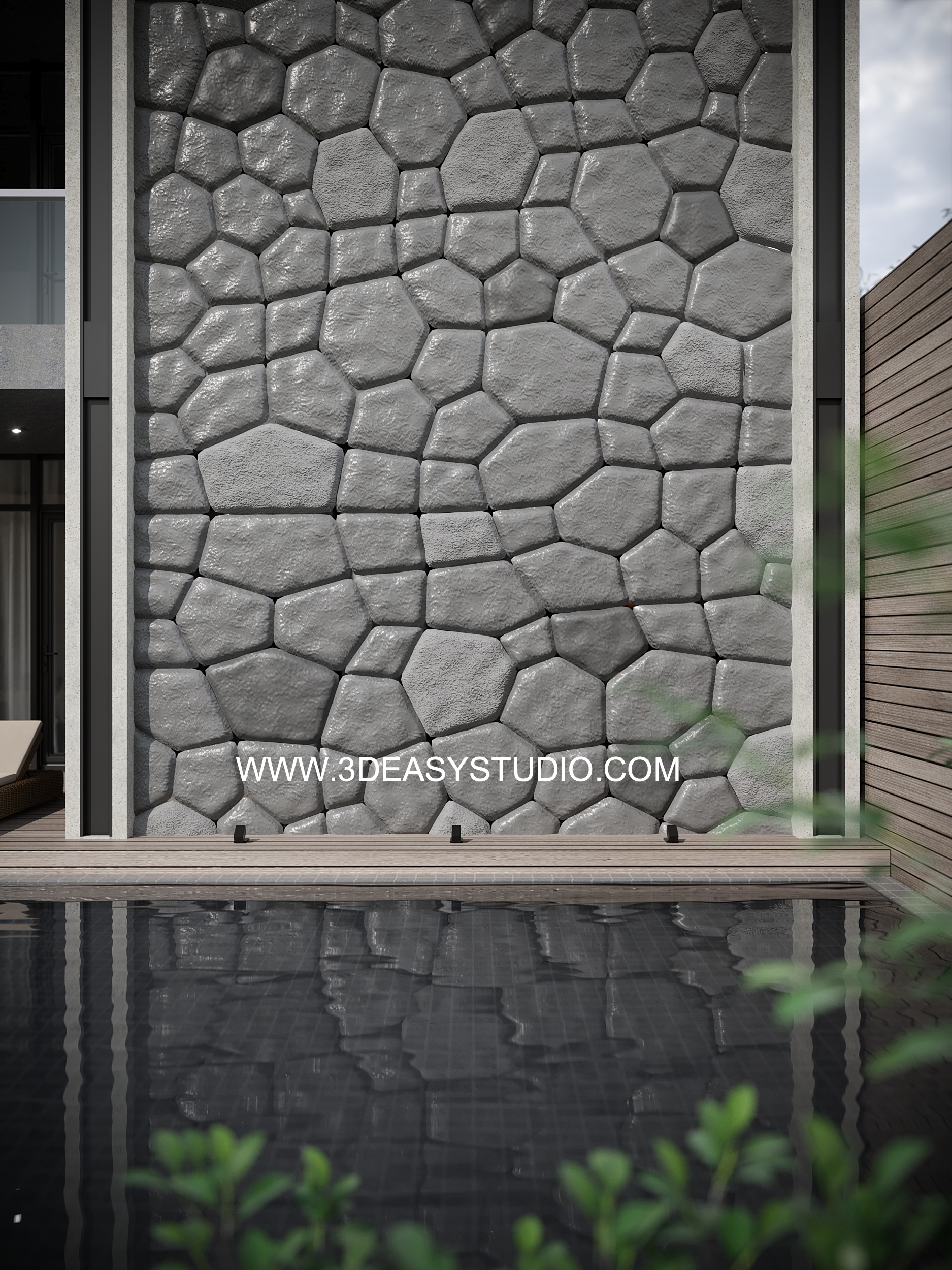 รูปแบบผนังรูปดาวหกแฉก เล่นระดับความตื้นลึกได้ด้วยเทคนิคพิเศษ ปรับแต่งขนาดกว้างยาวลึกได้ตามต้องการเสร็จแล้วสามารถใส่ Material สีสัน และ Texture ได้ตามต้องการ