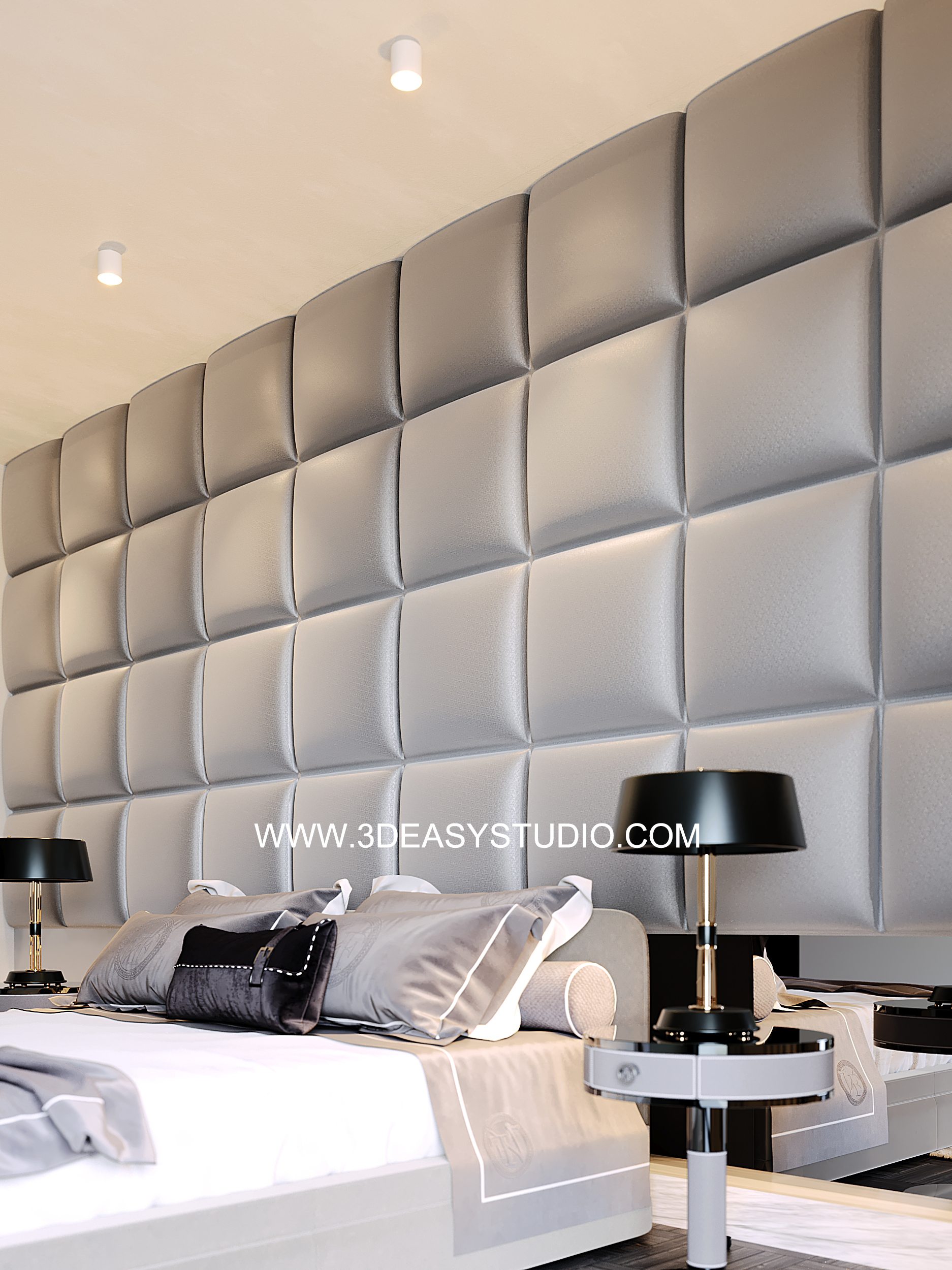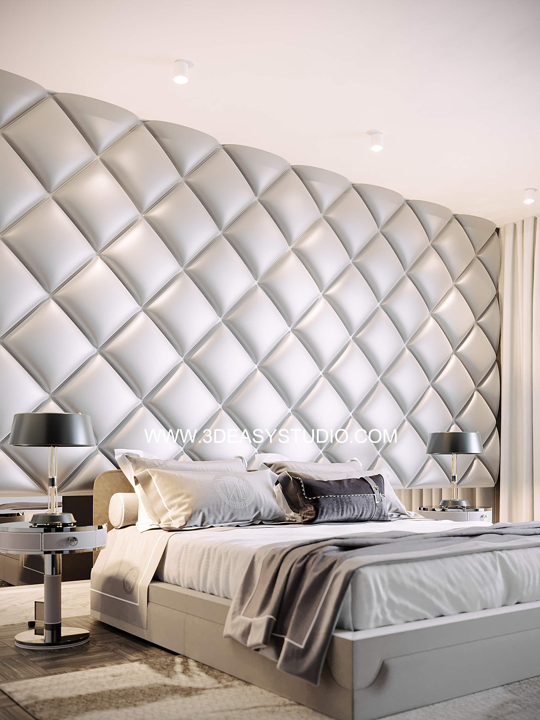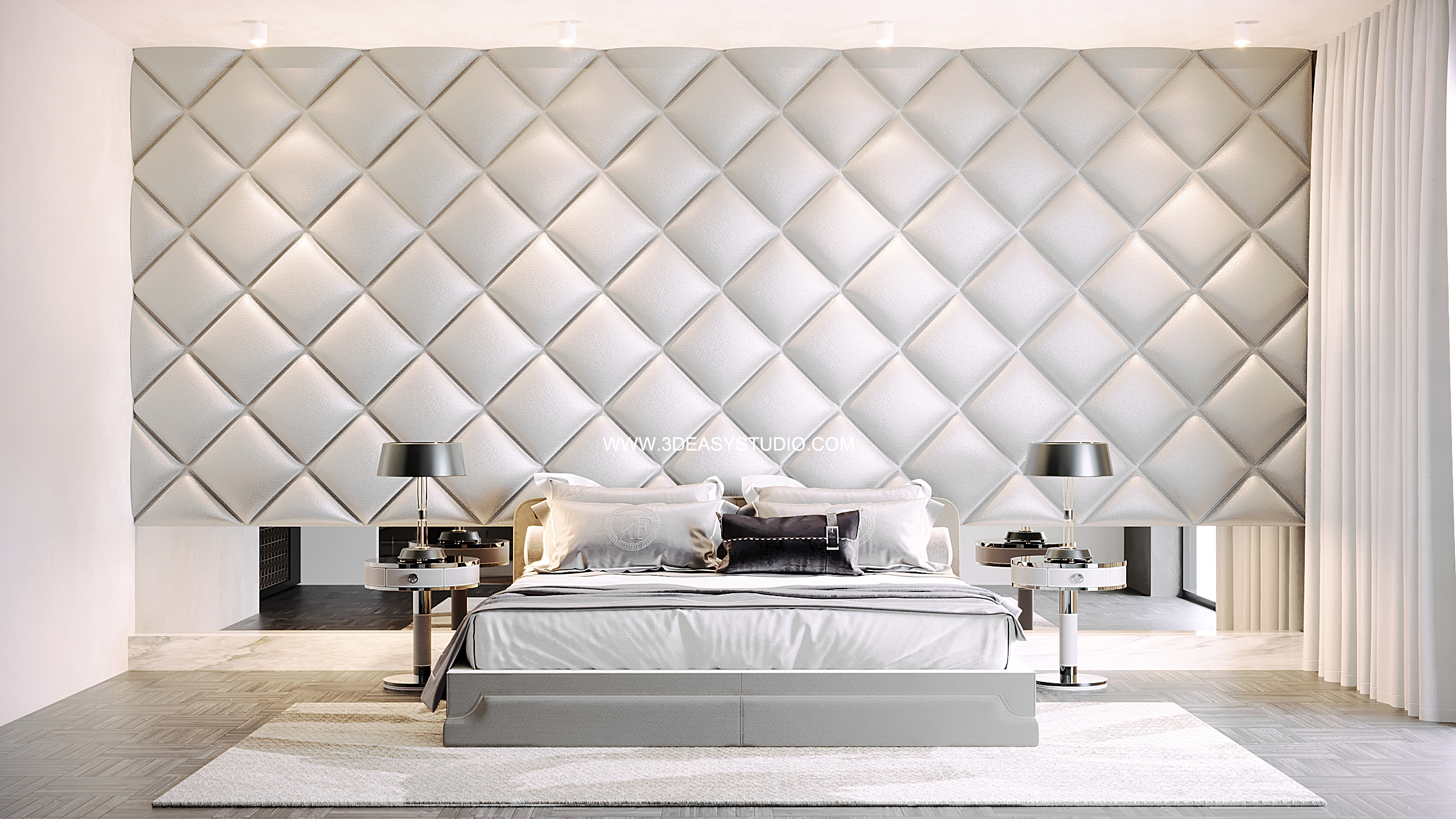 ผนังบุนวมนุ่มๆรูปแบบลายข้าวหลามตัด ทั้งแผ่นเป็นชิ้นเดียวกัน ปรับระยะความหนาของเบาะ ปรับรอยดึงเย็บและขนาดความกว้างยาวของเบาะได้ ตามต้องการ เสร็จแล้วสามารถใส่ Material สีสัน และ Texture ได้ตามต้องการ