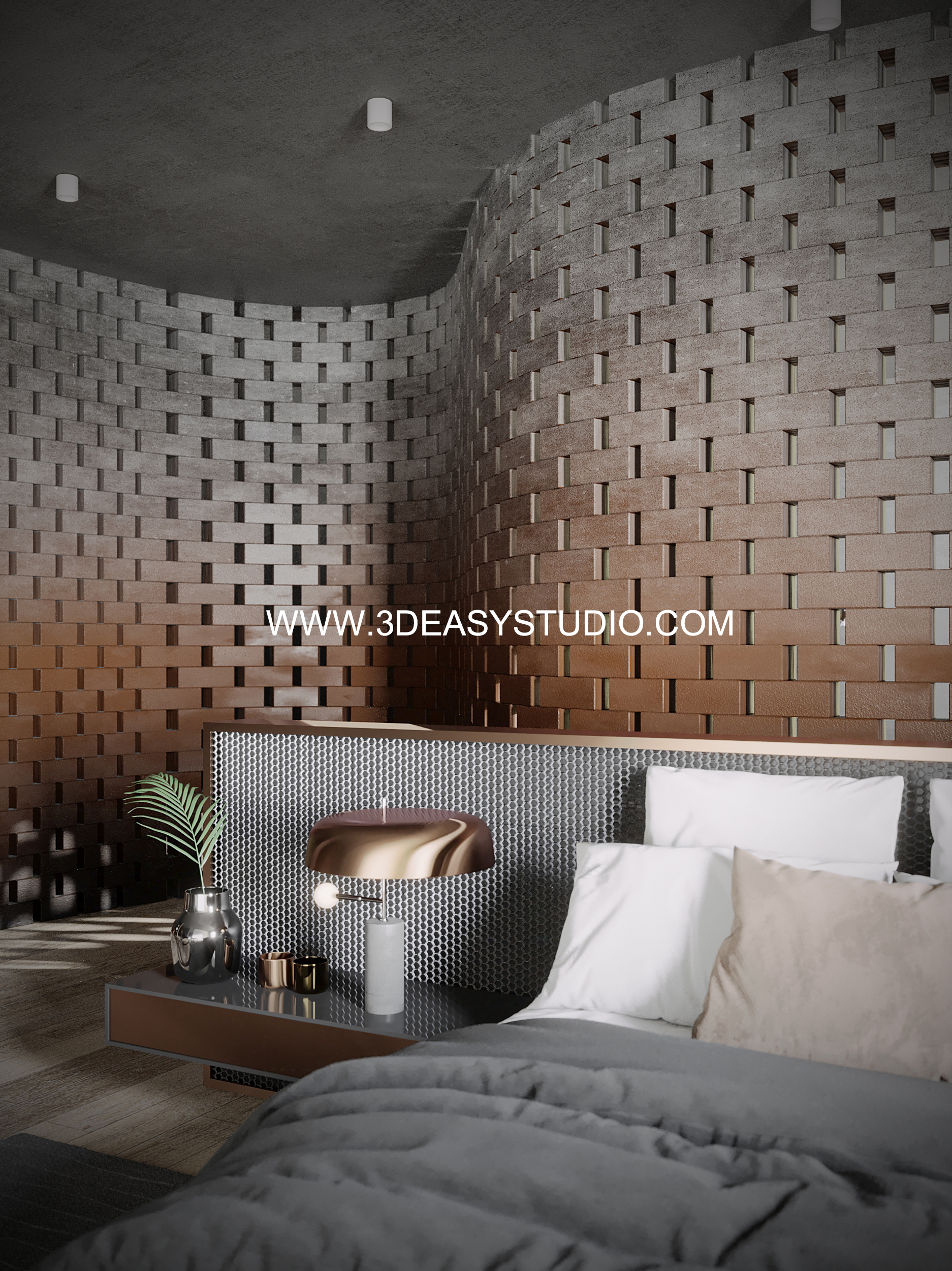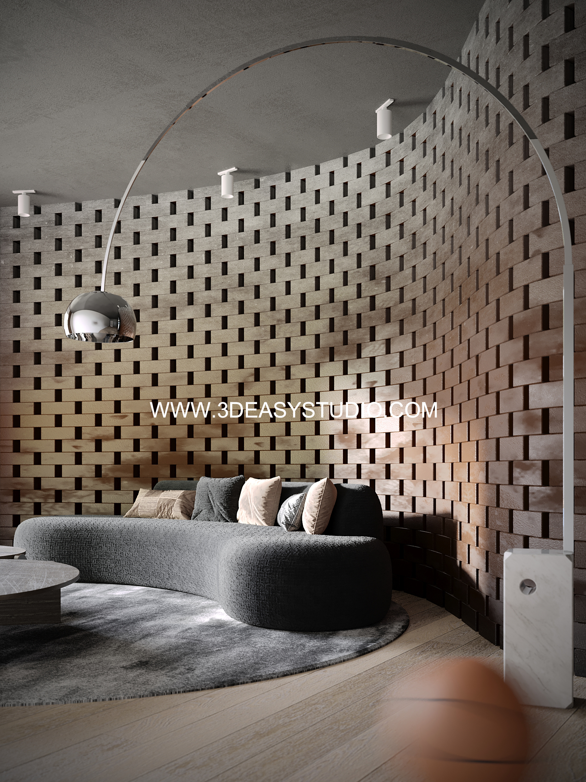 รูปแบบผนังอิฐบิดโค้งได้ ขนาดอิฐ ความยาว และรูปแบบความโค้งปรับแต่งได้ตามขนาดที่ต้องการ เสร็จแล้วสามารถปรับใส่ Material เลือกสีสัน และ texture ได้ตามต้องการ